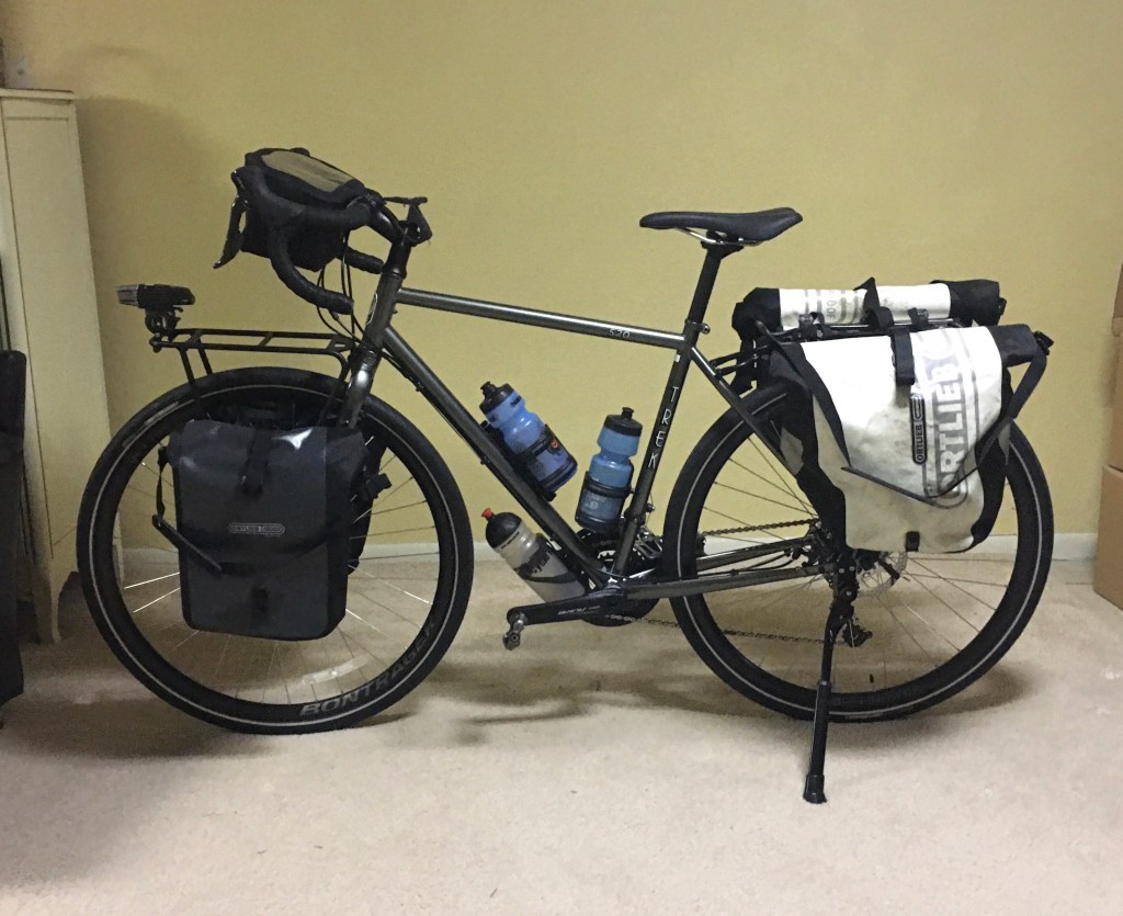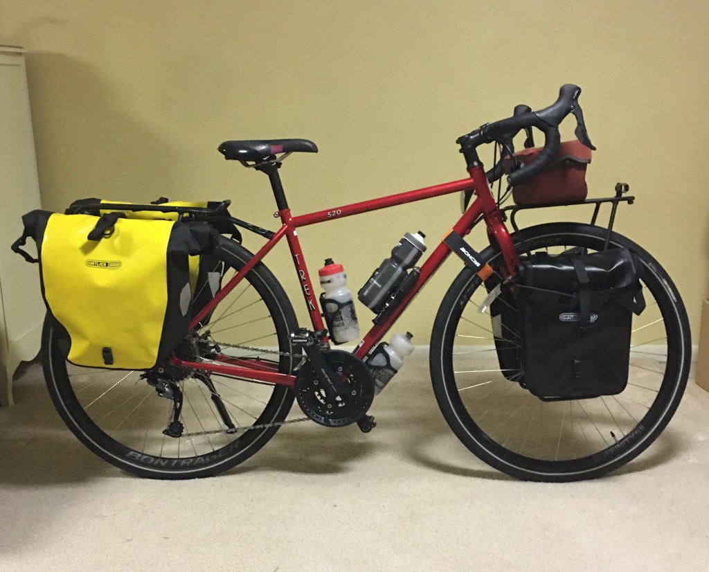 Next step is to load the panniers for weight distribution and balance. Figuring about a /60/40 weight split with heavier items in the front of the bicycle.