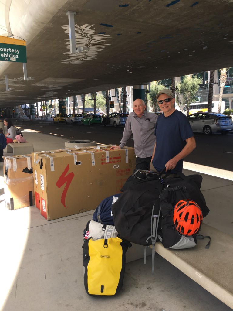 Easy plane flight to San Diego. Mia (Curt’s wife) gave us a early early ride to the airport. We were at the airport 4:20 (6:10am flight), no line. With our 3 large bike boxes the Delta desk crew had some work to do! First time they had bikes (or so it seemed). They had to look up all the rules after we told them they now are considered baggage, like skis or golf clubs. Needless to say the line began forming behind us! TSA were shaking their heads because they had to open and inspect them.