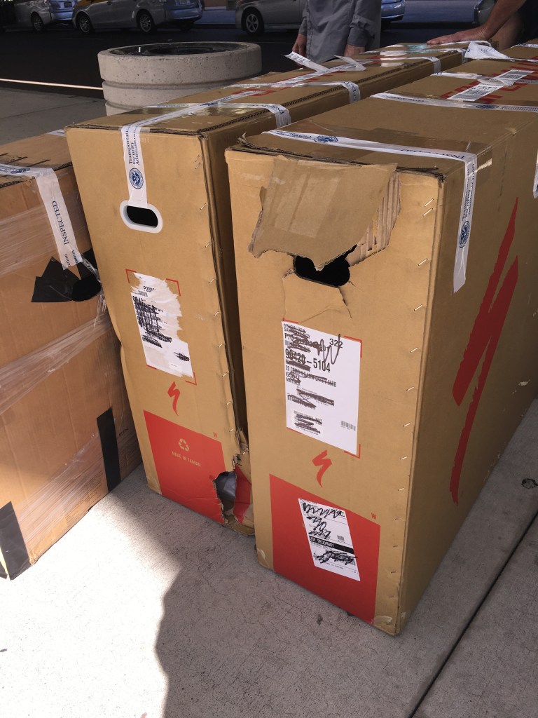 The bikes arrived safely. Jim and I had some pretty heavy duty boxes for e-bikes. Curt’s was more used looking. They handled Curts gingerly and seemed to rough ours up a bit more..some pretty good gashes and ripped off handle holders. But nevertheless inside all was good.