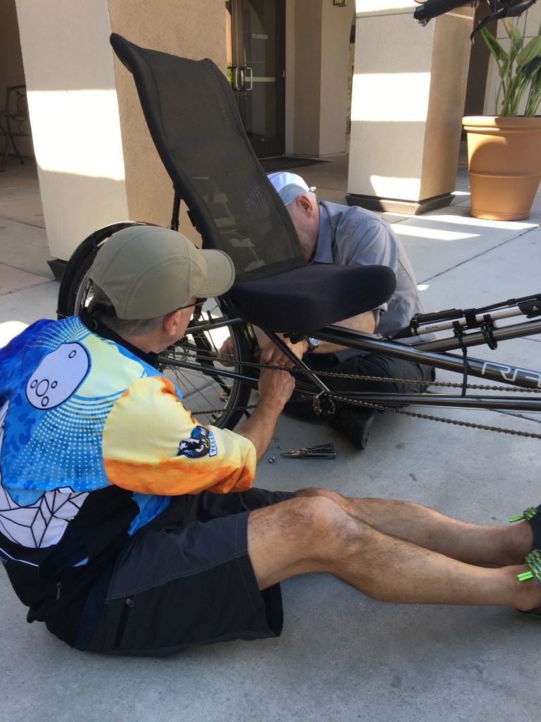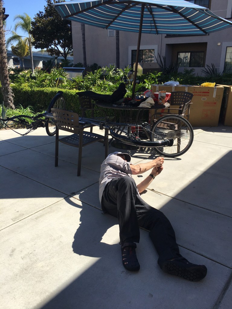 Assembly at the hotel, outside on a nice patio deck. 64 degrees. It took the guys 3-4 hrs to get them all put together. Met a really nice hotel worker named Mercedes. She was very curious about our adventure. (Wish I thought to take a picture of her). Meanwhile I took a walk to the grocery store for lunch and fruit. After my bike was assembled I took a ride to Dicks Sporting Goods for jetboil fuel. My introduction to riding in heavy traffic but California has bike lanes on all the major roads.