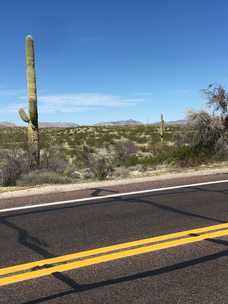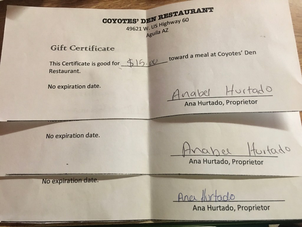 It took many hours to get to this little town called Aguila.. I had called Warmshowers for a place to stay. She couldn’t host us but she sent us to the library where we could get vouchers for meals at the Coyote Cafe! Seriously they gave us 3-$15 meal vouchers. Tiny little town generosity. (Plus you have to contact the right person)