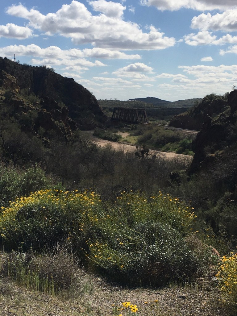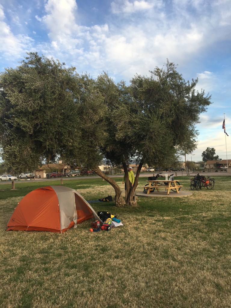 To answer a few questions. No we haven’t been to a hot springs…yet. Yes we are taking our first day off on Tuesday. The plan is to set off again Wednesday but we will be checking the weather to the East. Tomorrow we have about a 50 mile ride through greater Phoenix heading southeast to Mesa. Jims good friend/ former boss/former coworker (Tom S) is wintering in Mesa RV Park. He’s out of town right now so he’s offered it to us. Isn’t that just about the kindest thing to do? We are really grateful and looking forward to all the comforts of home for 2 nights!!