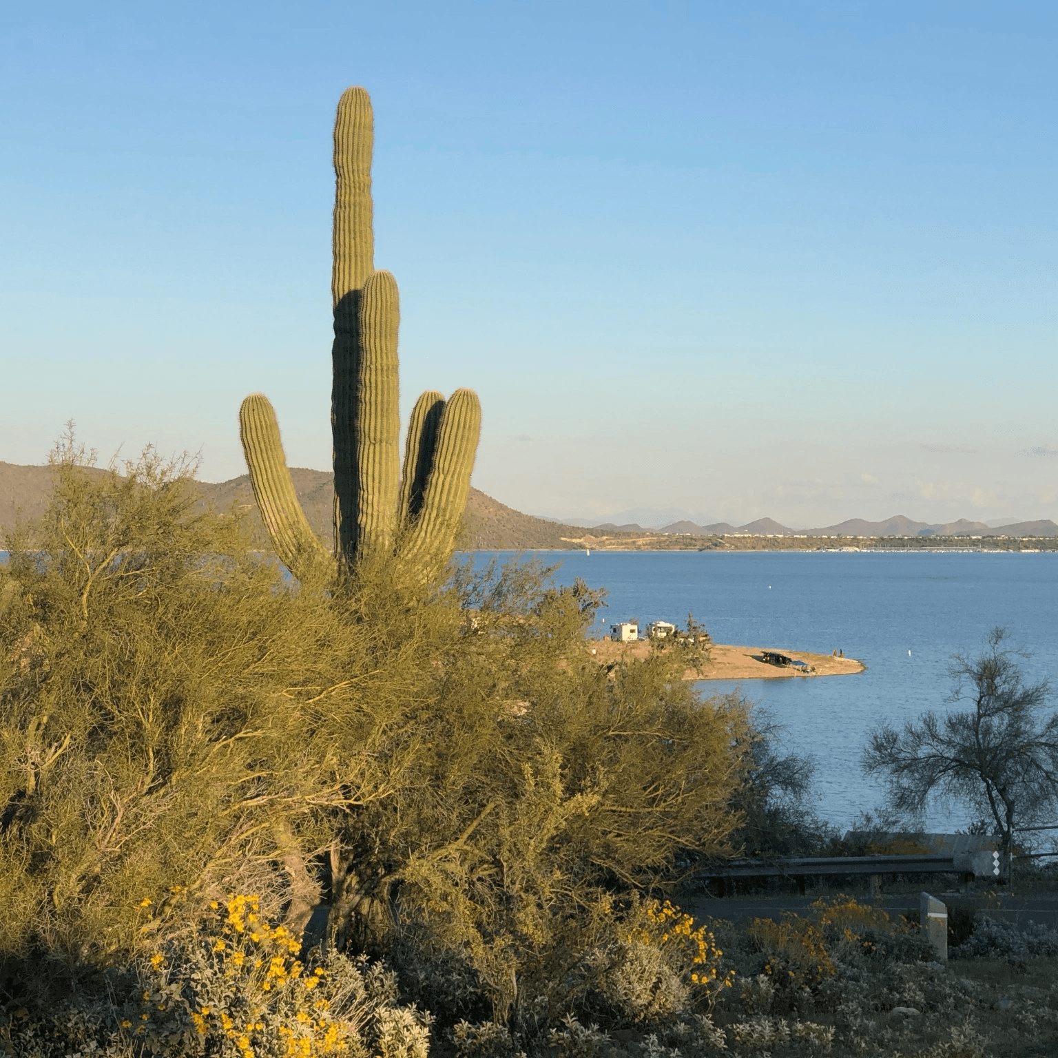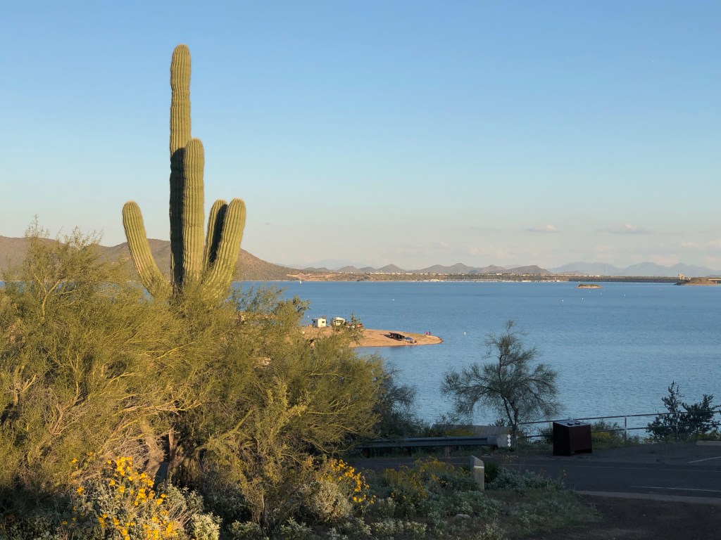 Tonight we are camped in a beautiful regional park northwest of Phoenix. It’s called Pleasant Lake. We are high on a hill above. Best of all it has showers. It’s been 2 days so all of us were looking forward to that. The moon is almost full and it looks great in the dark.