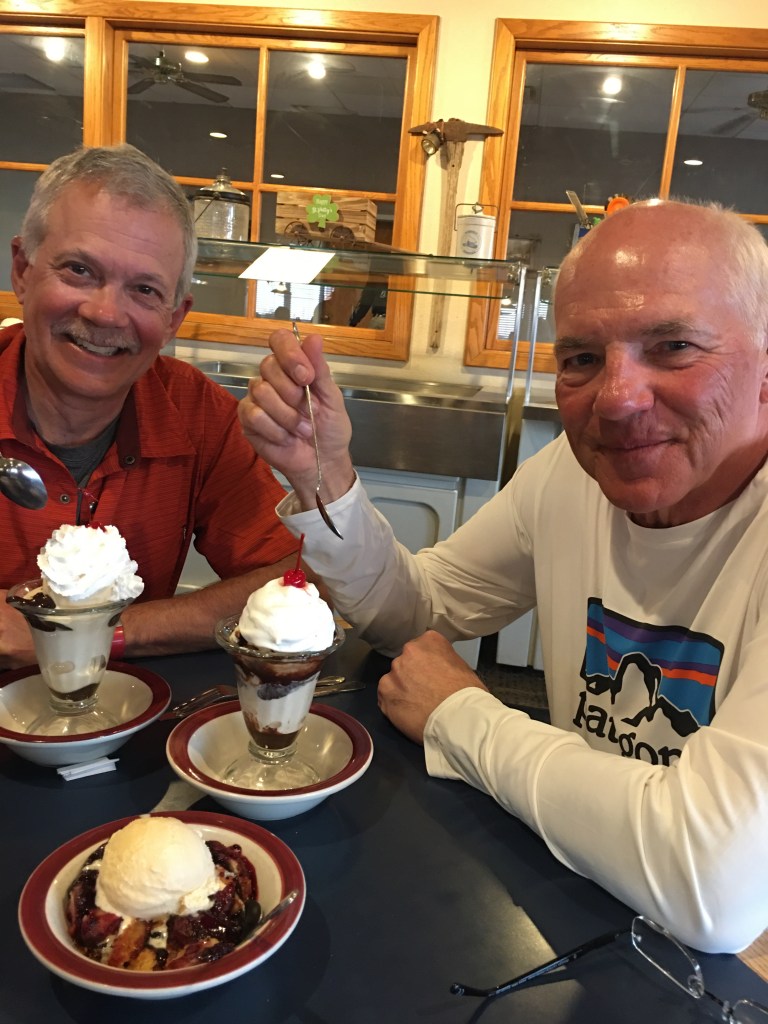 2. Good thing you refrained from hugging and shaking hands with the ice cream girls! Hopefully all the fresh air and exercise will attribute to some immunity from the dreaded virus. Having encountered the first gnat attack are you expecting more insect swarms?The ice cream looks like it came from an old fashioned soda fountain with the real glass dishes/like a time warp! Yum!Peggy