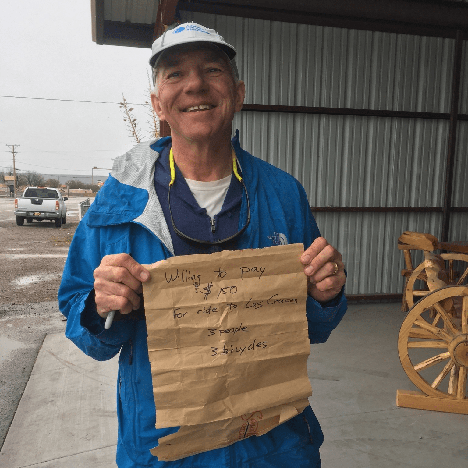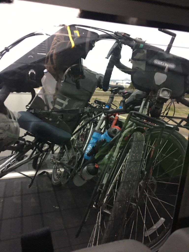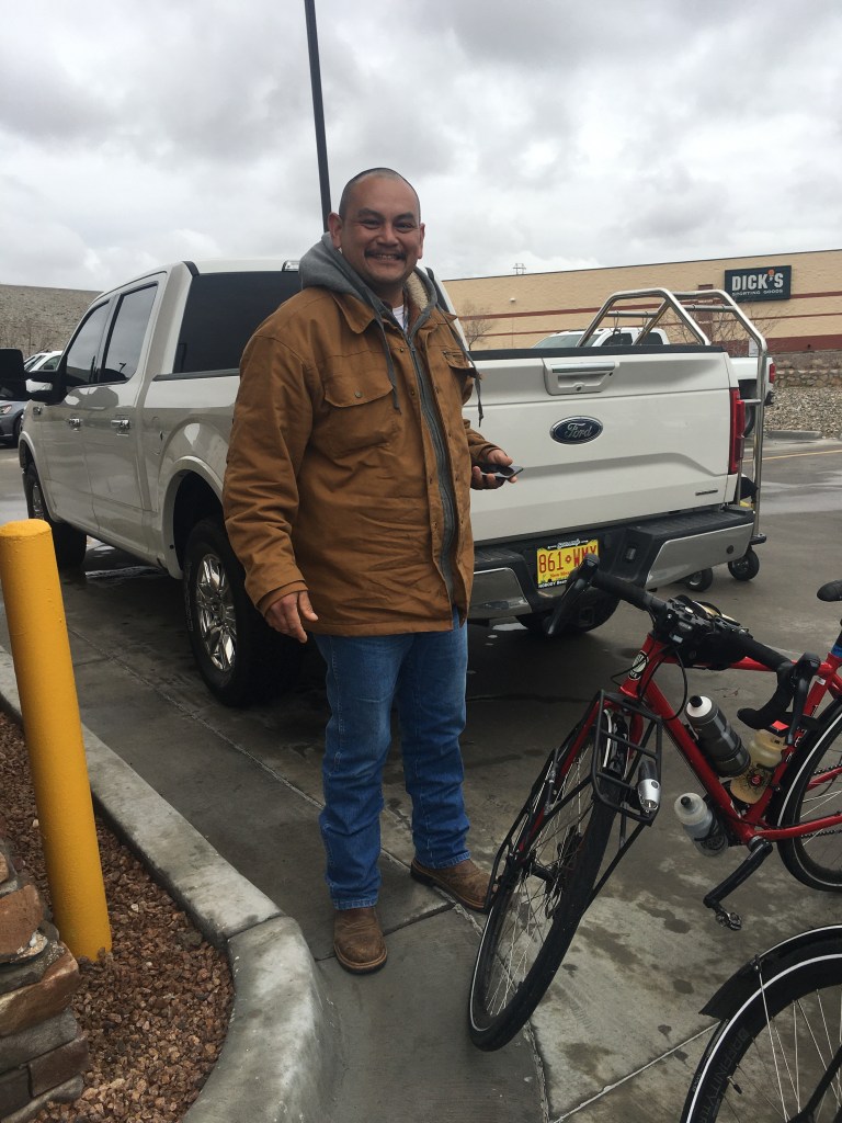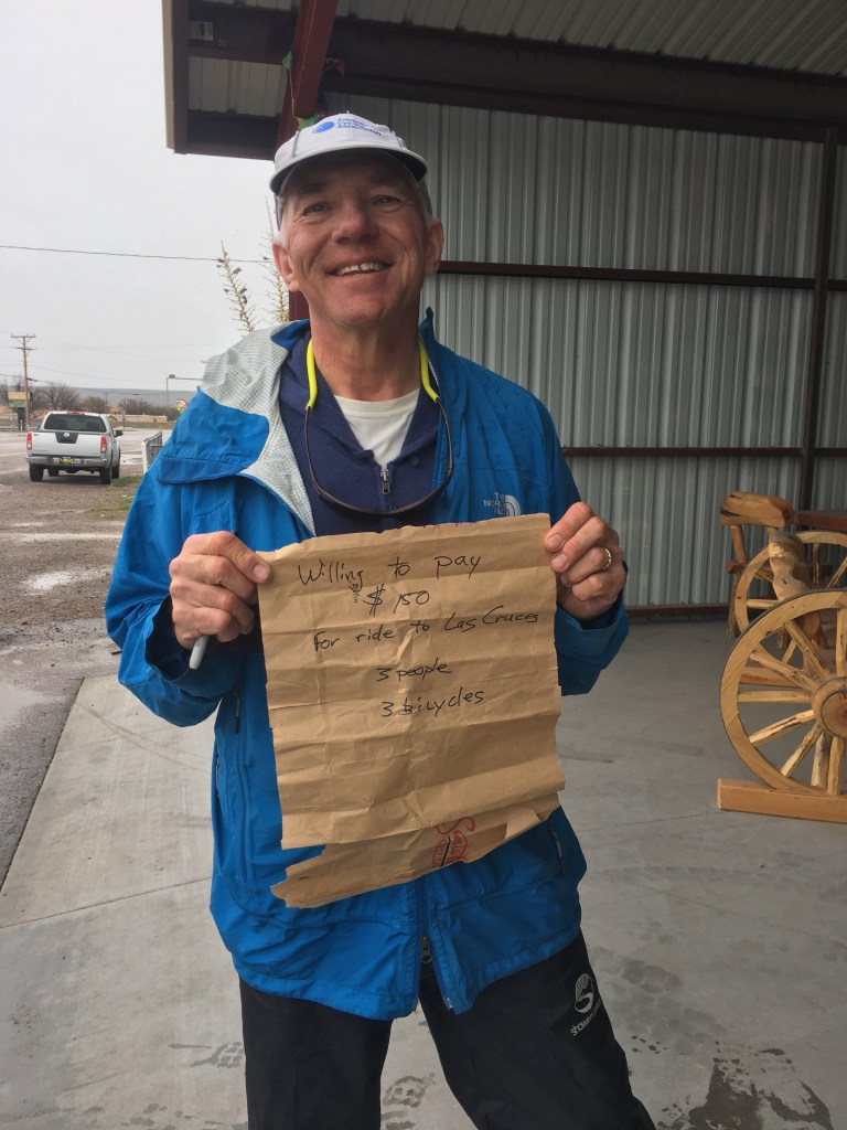 We weren’t certain if we were going to get to Arrey, Hatch or Las Cruces. All rain dependent. Cruised through Arrey when it began to rain. Suited up and made it to Hatch. It wasn’t raining hard but it was steady. Our rain gear is good but we all thought maybe moteling up in the only motel in Hatch would be good. I also had a hankering for some Hatch Green Chile food! However the lonely little motel was full…migrant workers in the green Chile, pecan and whatever other food products grow in the Rio Grande Valley. We did find a place to hole up in a closed laundromat next to the motel. We considered just camping in there but some young girls from town also knew it was a hideaway so that wasn’t going to workout. Curt decided we should make a sign at the gas station near the I-25 to ask for a ride to Las Cruces about 40 miles away. 3 riders, 3 bikes, $150. Got a ride within 5 minutes. Juan our friendly “non-Uber” said he goes to Las Cruces for gas so he felt like he won the lottery today. We thought the same thing. We are comfortably warm and dry in a motel👍🏻👏🏻🙌