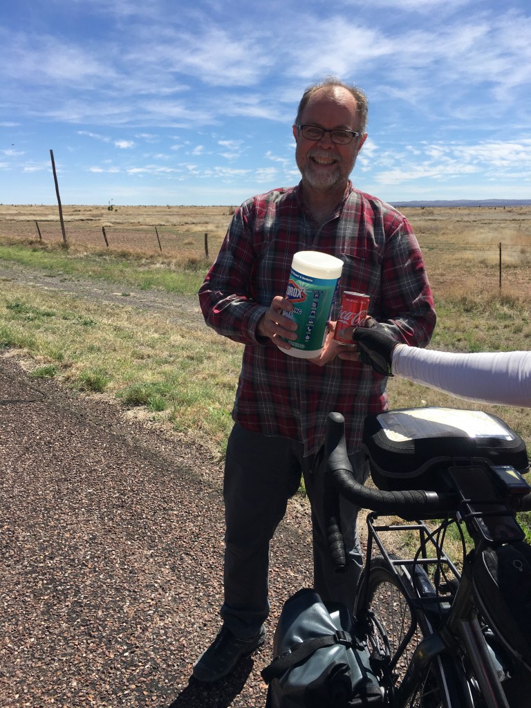 Starting to get close…20 miles to go. I’ve hit my 3pm slump and a man has pulled over on the highway. Super nice guy…J (something) Fischer from Ft Worth He’s offering us ice cold cans of coca-cola.. Yes! Just what we needed to make it into Marfa!
