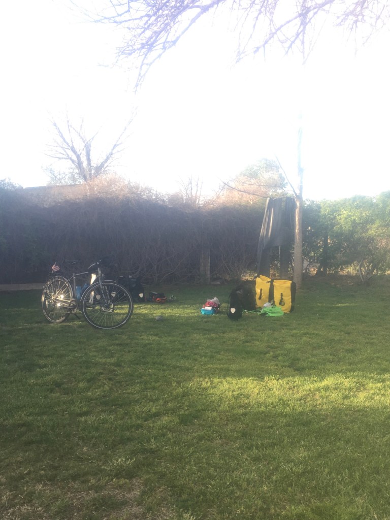 Actually we rode to the local hostel, see photos. Ingrid said come on in. Don’t pitch a tent, stay inside and make ourselves at home. She saw us coming! Complete with a bathhouse, towels, rooftop futons. You can check this place out online if you’re curious. La Loma del Chiva. Absolutely the perfect ending to a great day! Today we are happy cyclists.