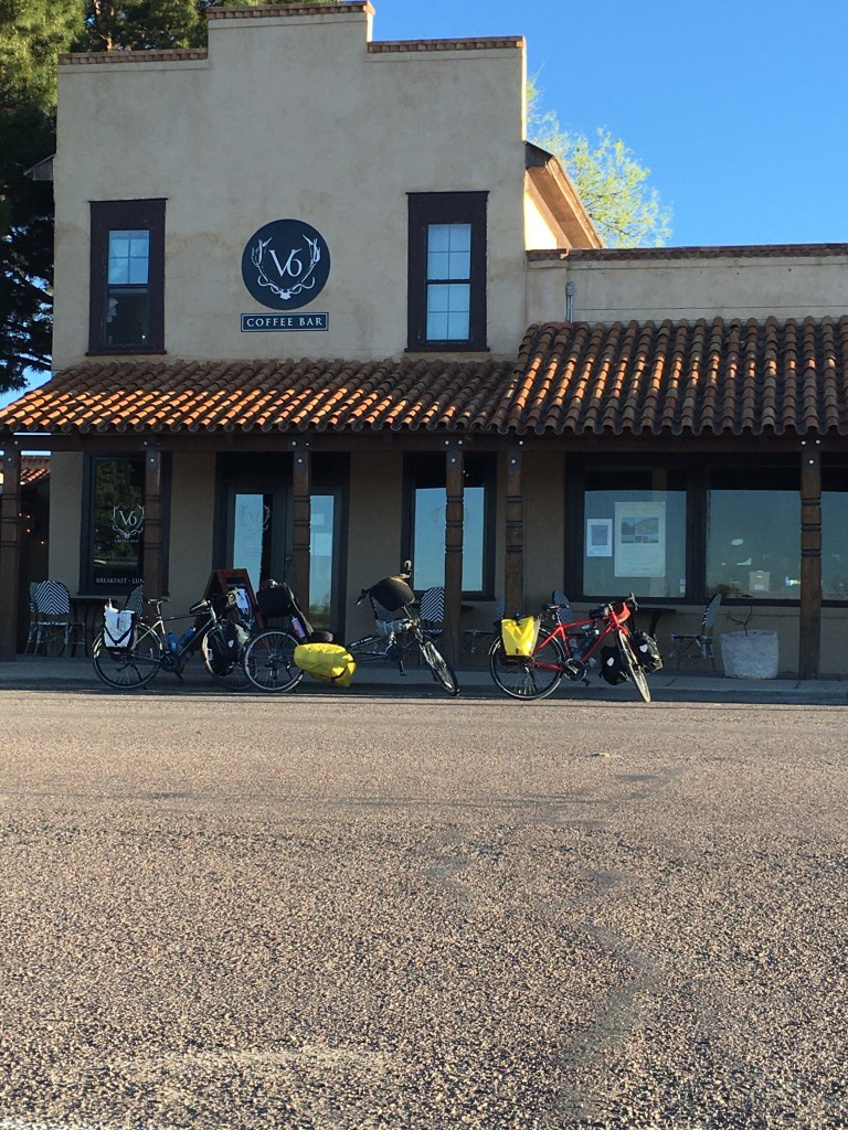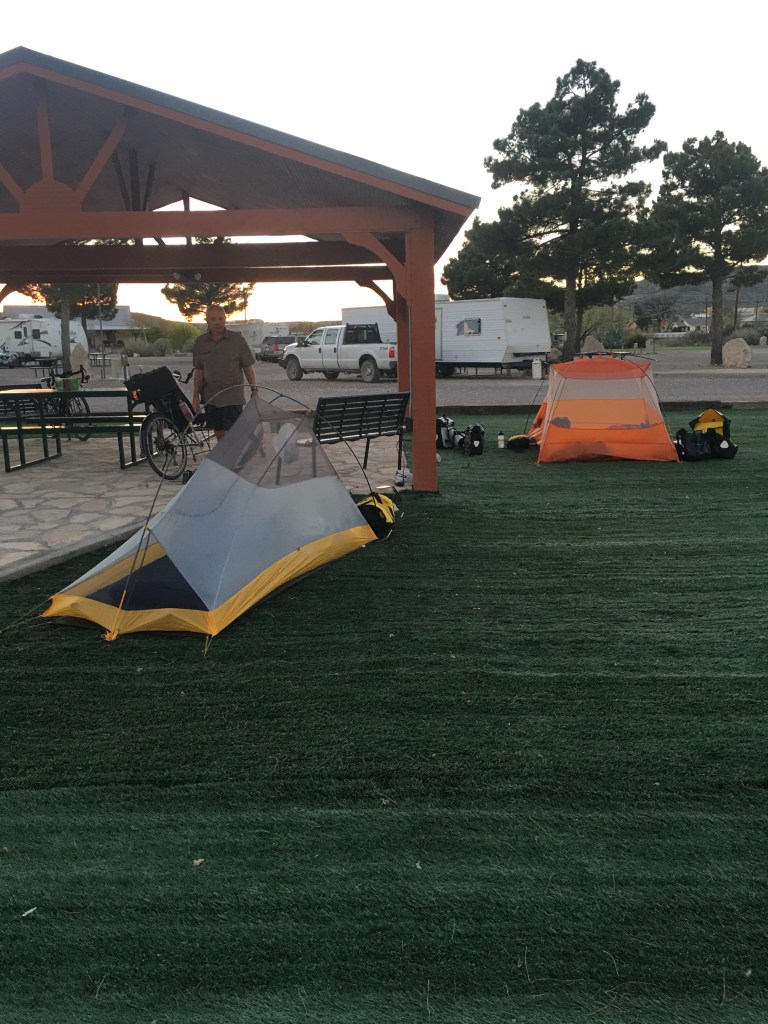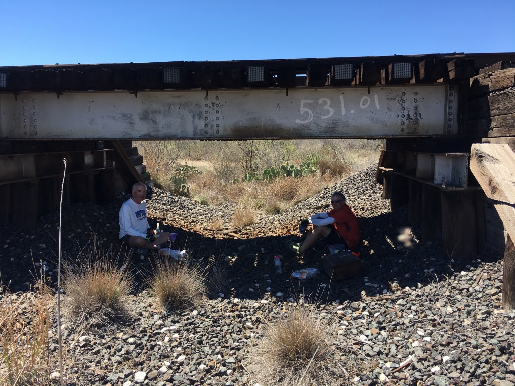 Just finished our ride. Earliest finish yet. 2:30pm. That includes Jim’s two flats back-to-back! That takes about an hour ( including unloading and loading your bike….twice!) Lunch stop on this hot and lonely highway was under a railroad bridge. Smelled a little of creosote. Started the ride at about 60’ and finished at 93’. Hanging out on the artificial turf at an RV Park in the shade of the picnic shelter. Yes…it’s hot.