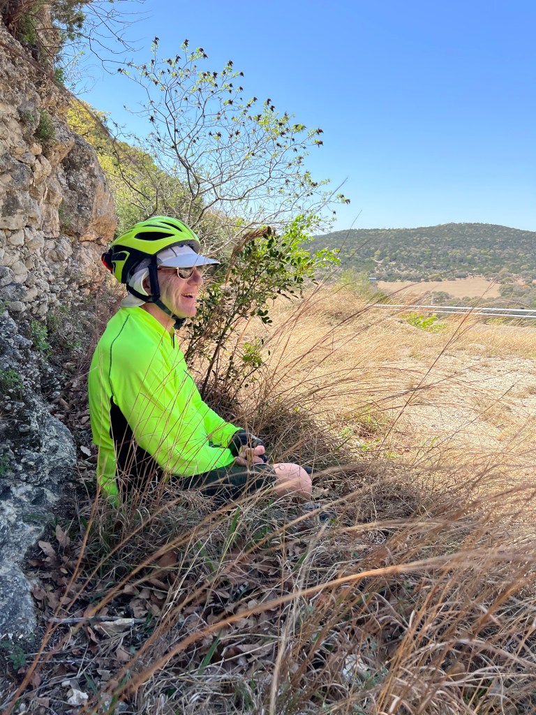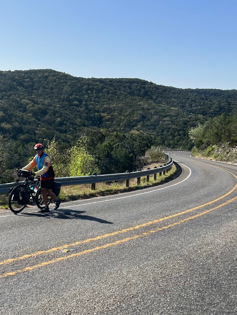 Next we had 18 miles to the camp at the Natural Area. (Run by Texas State Parks). 2 more BIG hills to climb. Temps today were much cooler ( guessing high 70’s). Wind kept us cooler and we had plenty of water!! Both these climbs were “hike a bike” too!