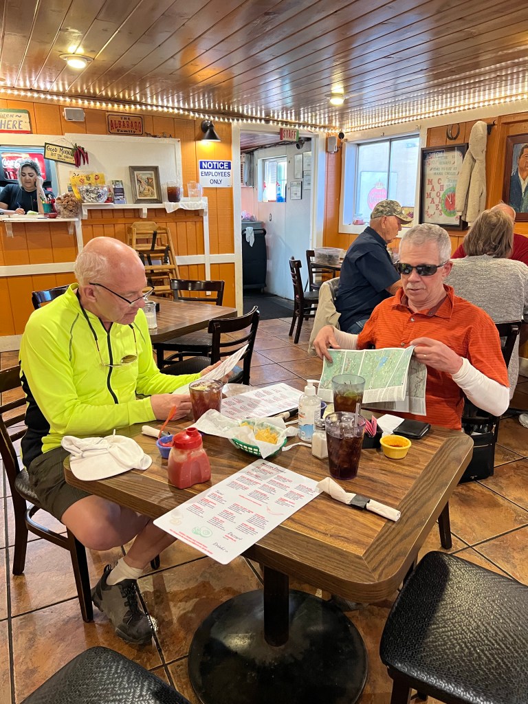 First big climb required some walking. It was steep and windy. Met a nice local man (Peter) who stopped while we were resting at a false summit. He was intrigued by Curt’s bike and our heavy bikes. He’s a triathlete so his rides and bikes are different but we were on his training route. He told us exactly what to expect. Once on top we had a nice plateau before a fast descent into Leakey (pronounced Lake-er).