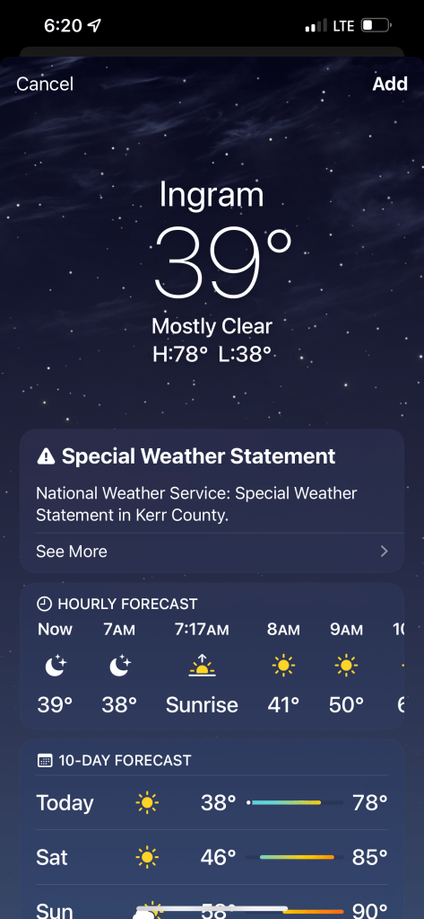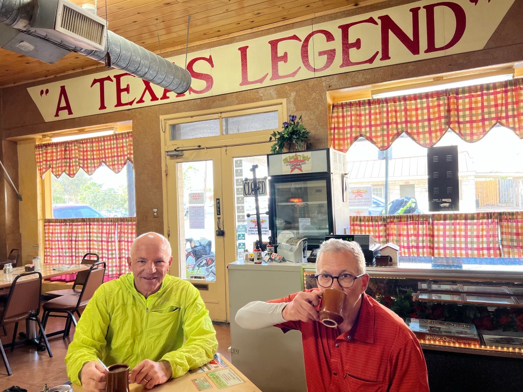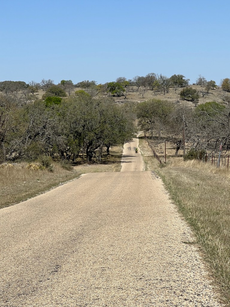 Our ride from Kerrville was on backcountry ranch roads. One steep long climb (walk) and then just rolling road for miles with cattle guards and literally no cars for 20+ miles. Winds were calm or at our back. We were in Texas heaven. Wish it wasn’t so dry.