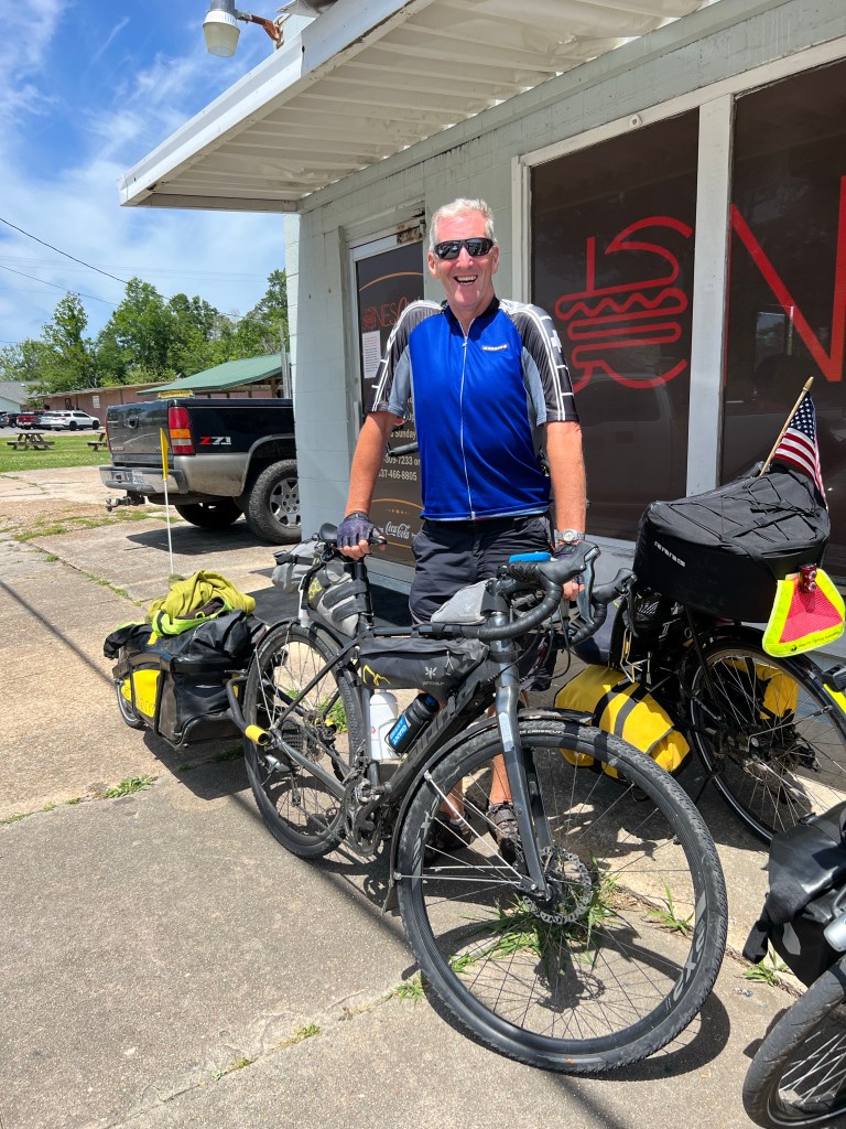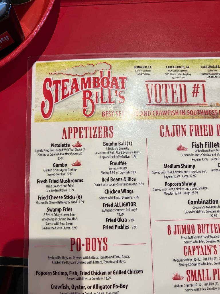 DeRidder layover was our introduction to Louisiana Cajun food. It’s a new experience for all of us. We went to Steamboat Bills and Izzy (Isabelle) was our delightful server. We peppered her with questions about food, local crops, and pronunciations. She obliged our tourist naïveté with humor and grace. She has relocated from New Orleans because of Hurricane Ida in 2021 to Pitkin, LA. Small town America. Honestly, one of the best parts of this ride is the people you meet! This supports my theory that most people are good and kind