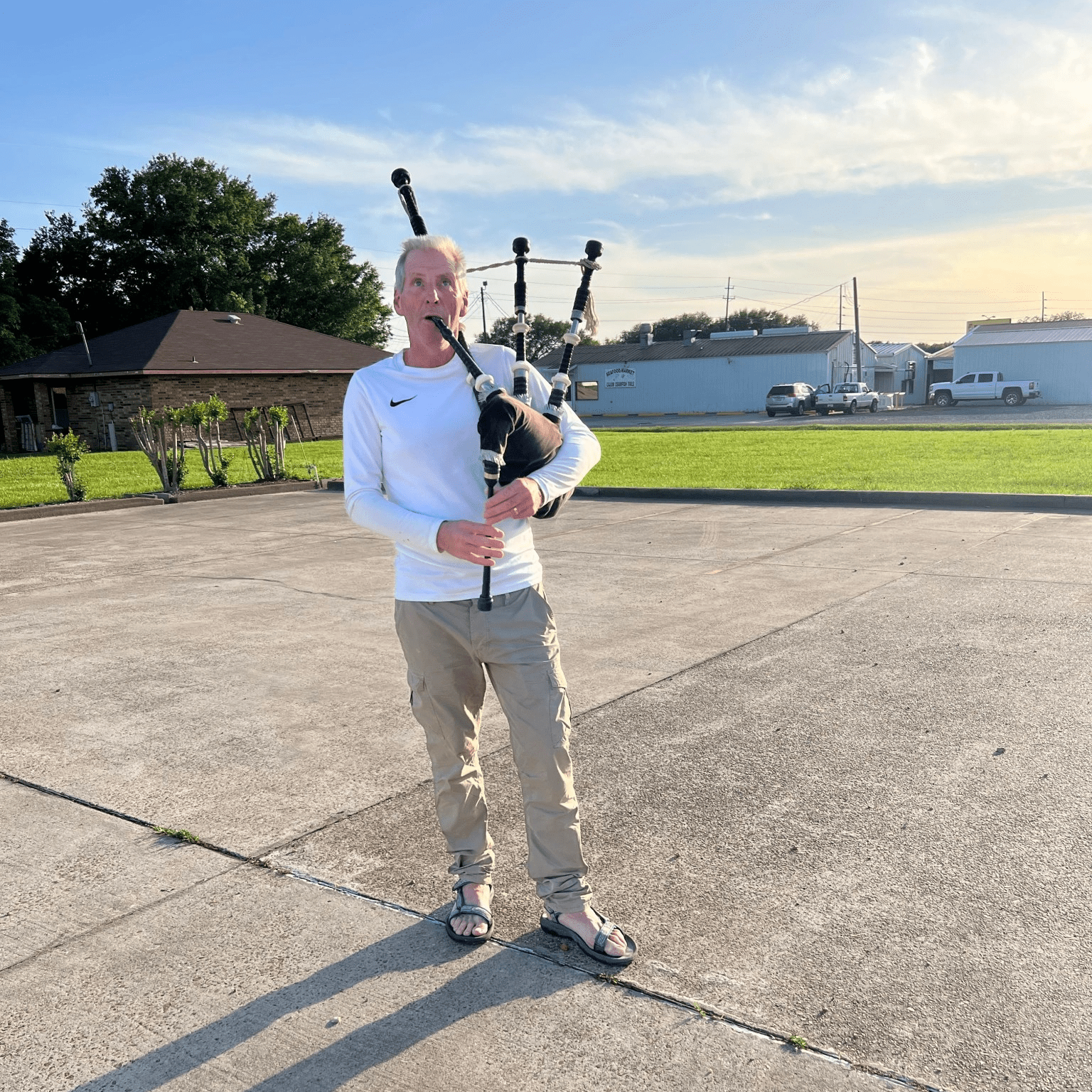 On our ride today we stopped for lunch in Oberlin at Jones Cafe. While there we met a fellow cyclist heading east. Sandy from Scotland is riding solo. He is pulling a “bob” trailer with his bagpipes in tow. We were all headed to Ville Platte so we met up at the motel and shared a Mexican dinner together and swapped stories along the route.