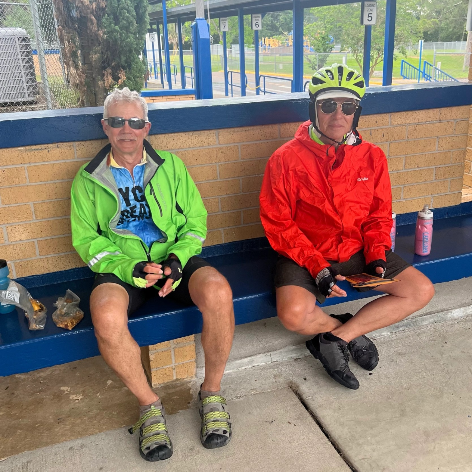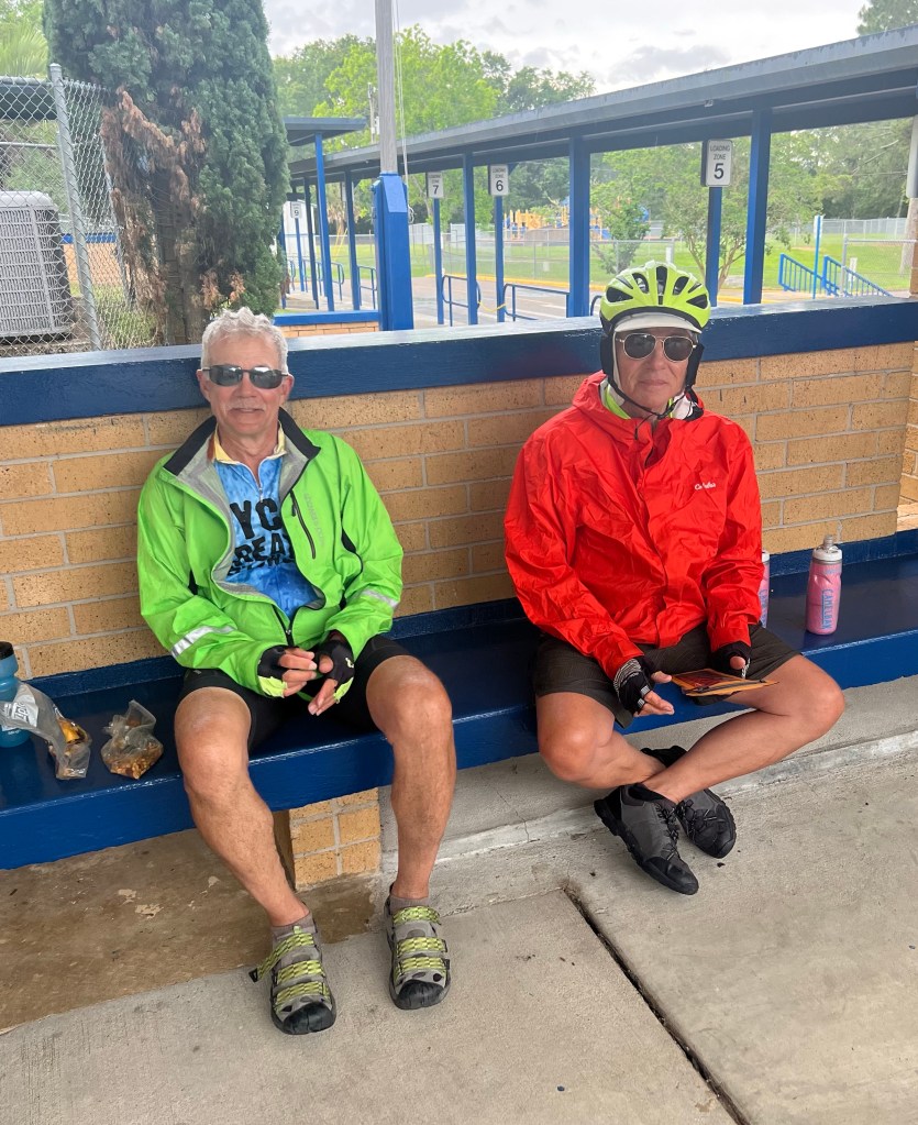 On the edge of Tallahassee we had 18 miles to go through the city to our destination. We are staying at our good friend Jamie C’s sister’s house for tonight and tomorrow…our layover day. Beth and Joe have a lovely home on a small lake in NW Tallahassee. If you route by bicycle in Google maps it will take you on roads with bicycle lanes as much as possible to your destination. It took us through several areas and neighborhoods all with bike lanes. A couple of the roads took us past some very beautiful southern homes with live oak trees. We were also riding with thunderstorms all around us. For a while we were in the “donut hole “. Jim kept checking radar😊. Eventually we couldn’t escape the rain…we sat it out for about 10 minutes and took refuge at an elementary school. But then we only had 5 miles to go in the rain. We climbed and descended for 5 more miles as it poured on us. We made it to Beth and Joe’s house. Tired and happy to be there. They beer’d and fed us, so we’re all good. Tomorrow is a day off. Yeah🙌