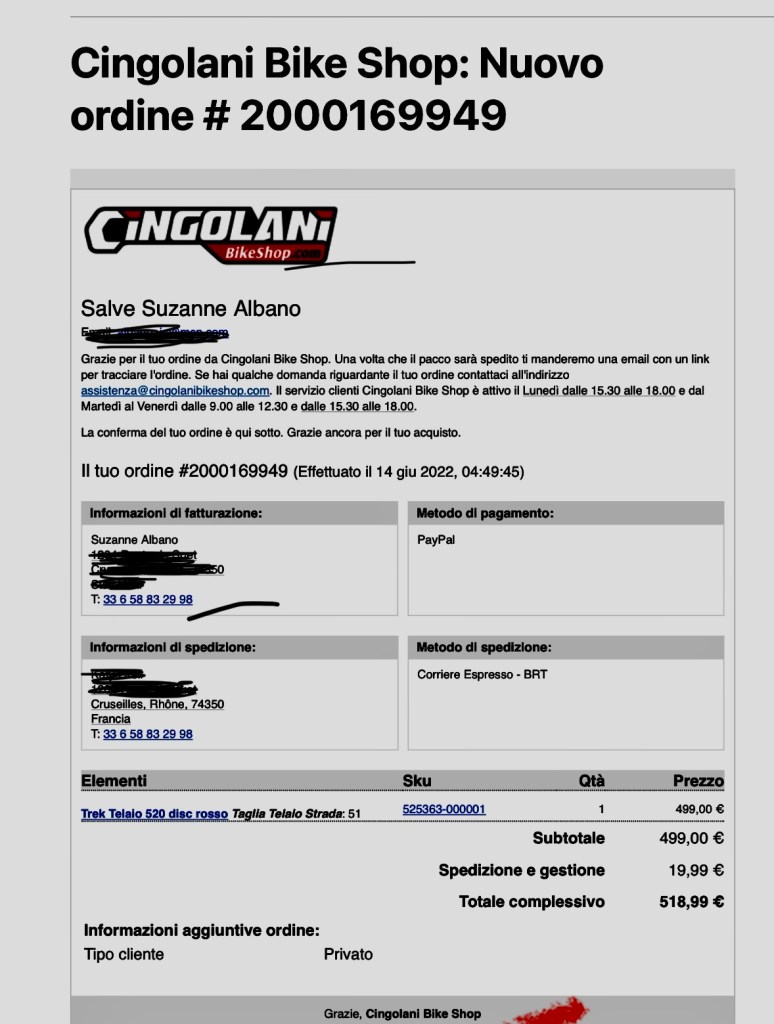I had insured the bike, but not enough to buy a whole new bike! Bike flights would only reimburse for a new frame. The search for an identical cherry red Trek 520 frame was on! Locally it was not possible to get a frame or a bike. In addition, Trek did not sell just the frame in the USA. San Diego had the whole bike my size but… it was going to cost me. As luck would have it, a local Billings bike shop found my size frame in cherry red at a bicycle shop in Italy! 😊 Great! Now I just had to figure out how to purchase it.