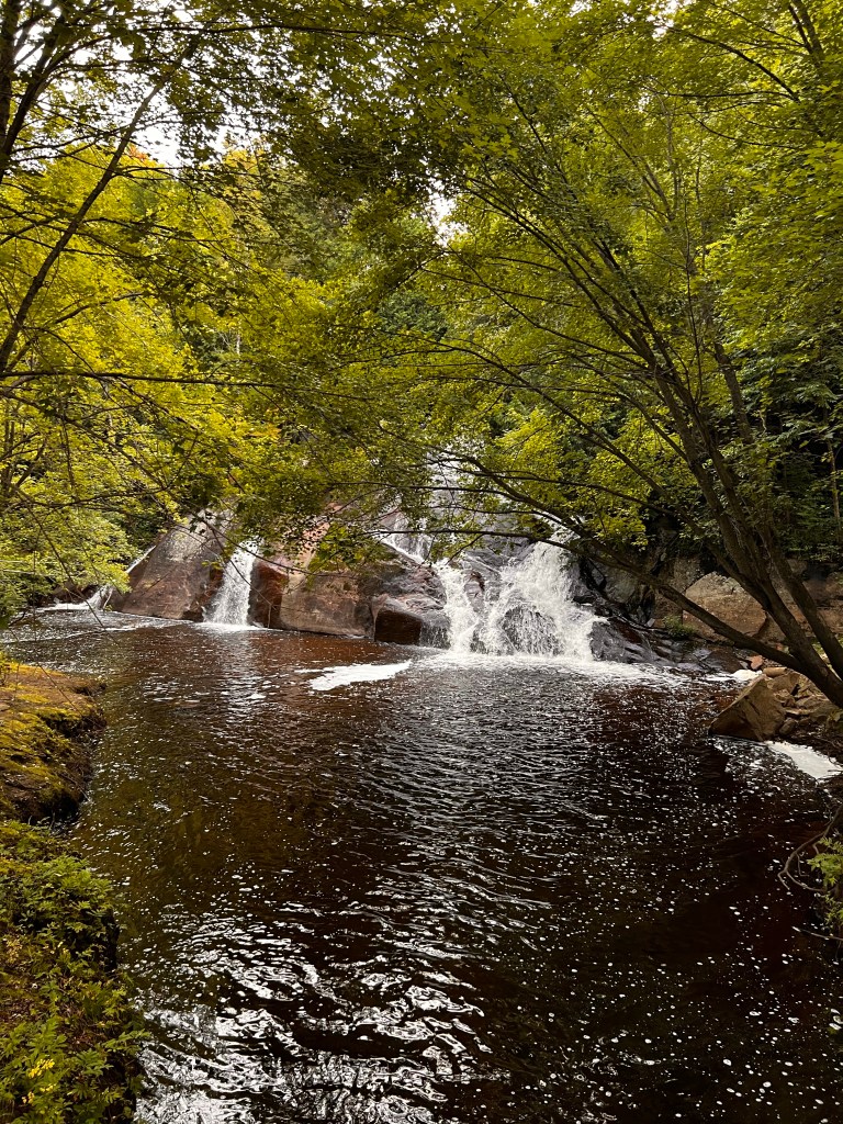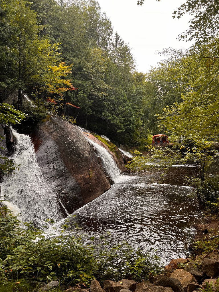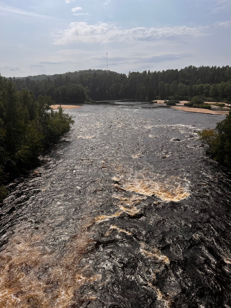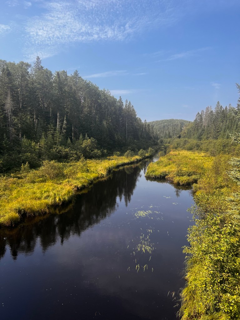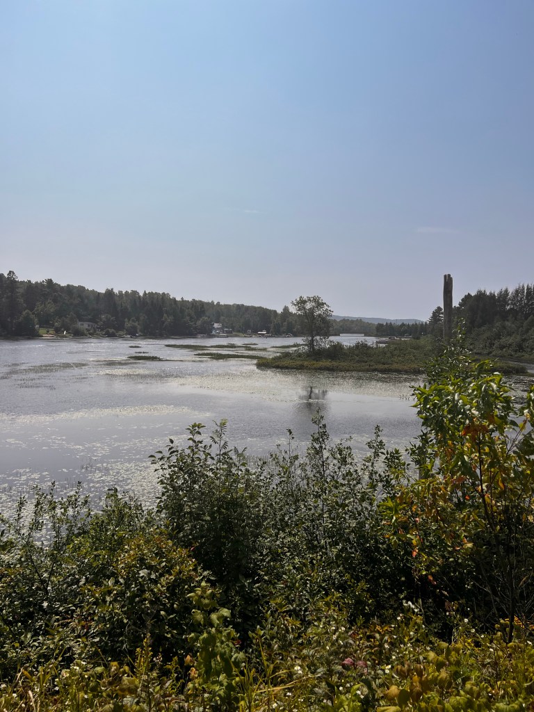 Perhaps many days on our ride will be lakes and rivers but todays ride along the trail was in the Laurentian Mountains! It is THE summer and winter mecca for Montreal-ites and Q-Citians. There are many, many cabins on the lakes, small local ski areas, rivers for canoeing and kayaking, power boats on the lakes, lake fishing. Everything you could want to get out of the city of 4 million and only a couple hours away ( by car of course)! It’s beautiful. I can’t help but think how gorgeous it will be in the fall with all the maples and birch trees and others that I don’t even know.