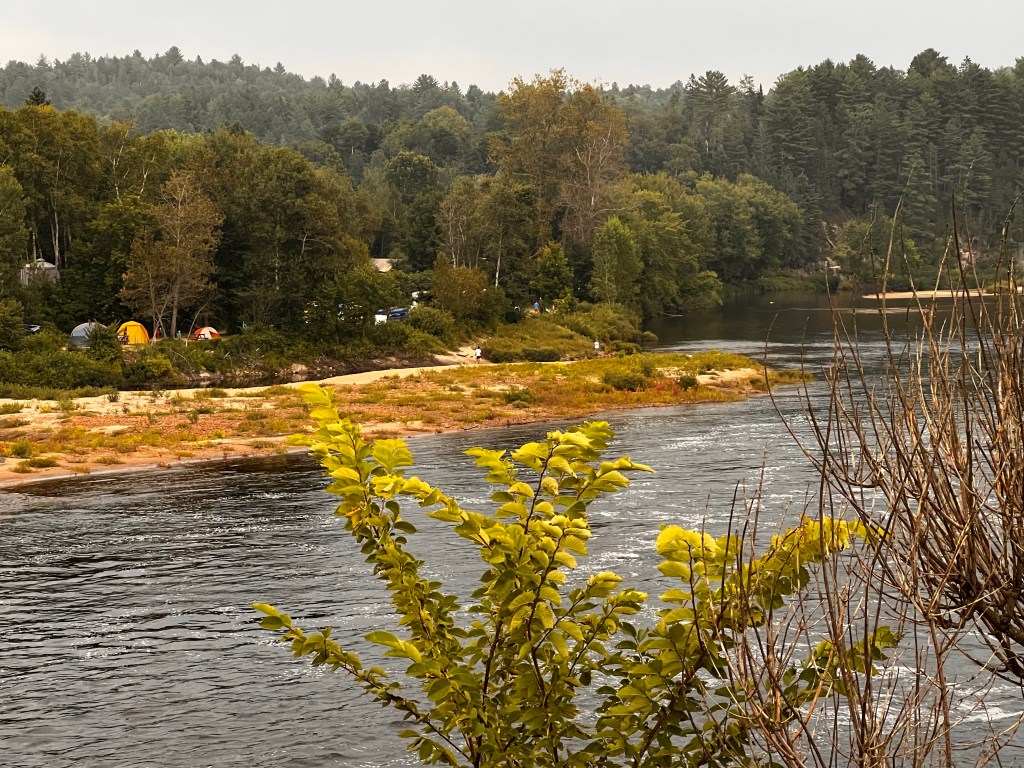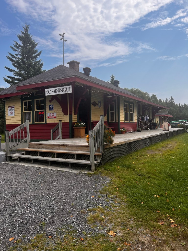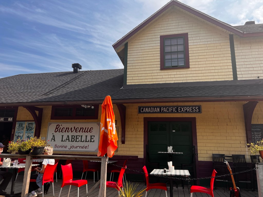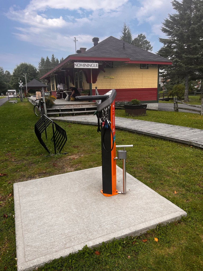 Little beaver damBeautiful upcreek effect of the beaver damAlong the route were several rest stop shelters. Usually there was a pit toilet a little ways beyond the shelter. They’re very cute, made to look like a cabooseOur lunch stop was in the town of Nominingue. They have converted the old train stations to visitor centers. This one had history of surnames in the area. I looked for Lemire but it was not listed in this area. Beautiful park area along this rest stop. All the main trail stops have bicycle pumps and repair attachments. Bathrooms, picnic tables and kids playgrounds. Nearby in the communities are lunch cafes, bed and breakfasts and sometimes motels and campgrounds. Bicyclists lunch today. Tasty😊Lake view just after our lunch stop. It is Sunday so people are outside playingRiviera Rouge. The Red River. We will be following this for a few days I believe. The sand bars look so nice. I was told it is a Class II River. Looks fun to canoe to me. Strange motel entry along the trail. Just advertising to cyclists. We did not stay there 😜Campground along the route. We did not camp there either😜Arrived in our destination. LaBelle. This station had a restaurant. Beckoned us in for a beer and frites ( fries) post ride. Also a museum on the end of itDisplay at the La Belle train station. The cart to load the baggage on the trainsOur campground is on Riviera Rouge. Best campground yet! Earlier the sandbar you can see was teeming with people on the beach and kids in the water. This campground has short term RV’s, several tent campers and then the permanent RV’s with their deluxe patios. Super nice place! View of our campground from the town. The tiny orange /white tent to the right of the big yellow one is oursA grotto at the other end of the campground. Cool place…. Literally and figuratively