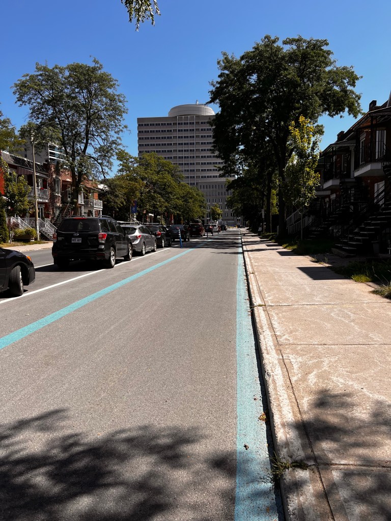 Same part of our 8 km ride to our rental. Parked cars between the bike path and the street. Sidewalk to our right.
