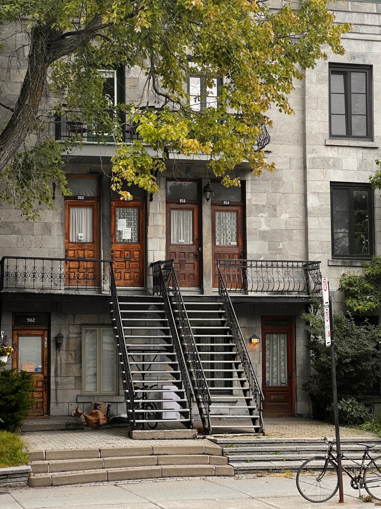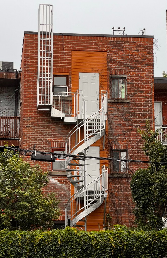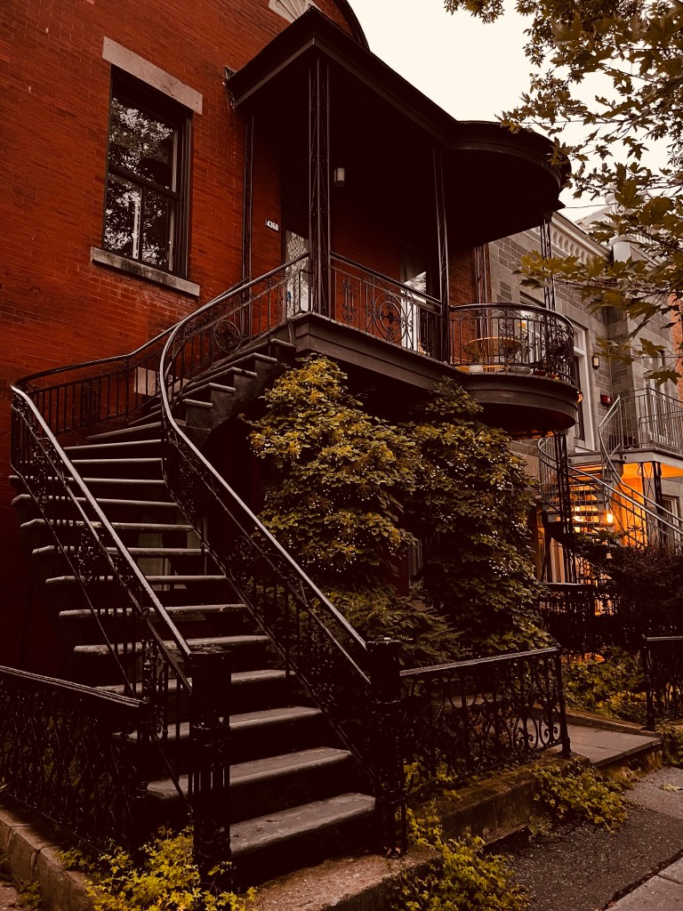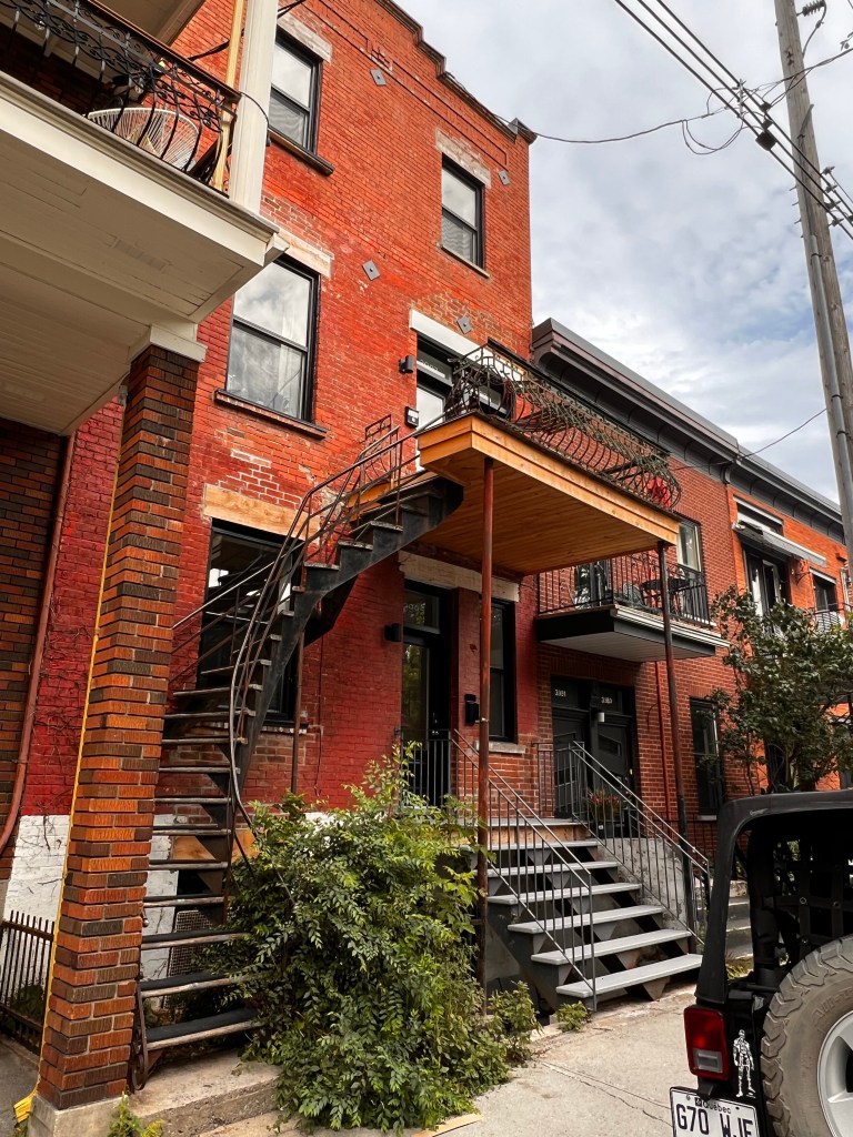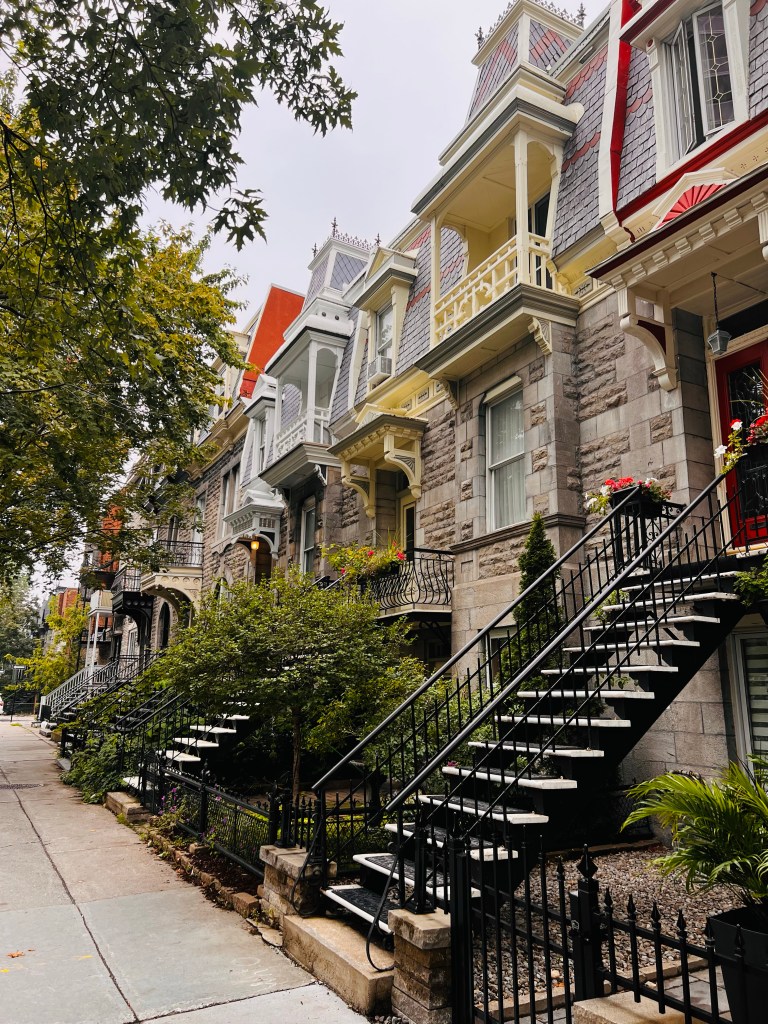 Then we took about a 7 mile walk to investigate some of the neighborhoods we passed yesterday on bus. It was a cooler cloudy day. We had rain last night but it let up for today. More rain is expected tomorrow. We wandered down to the riverfront, through the Old Montreal street… full of tourist souvenir shops and then through Chinatown. There is an underground area of Montreal that turns out to be a mall. Quick trip in and out of there! Walked through the Gay Village on the way back home. I’m guessing that is more interesting later in the day. I think my favorite part was the little parks as we walked up the streets and the homes with their staircases on the walk back!