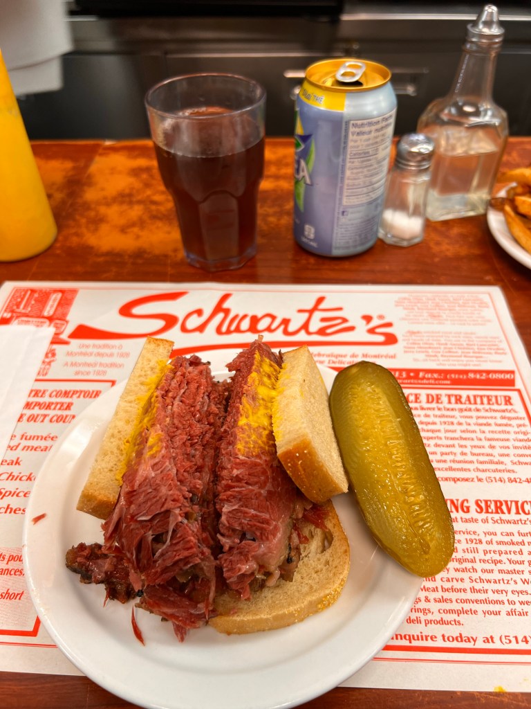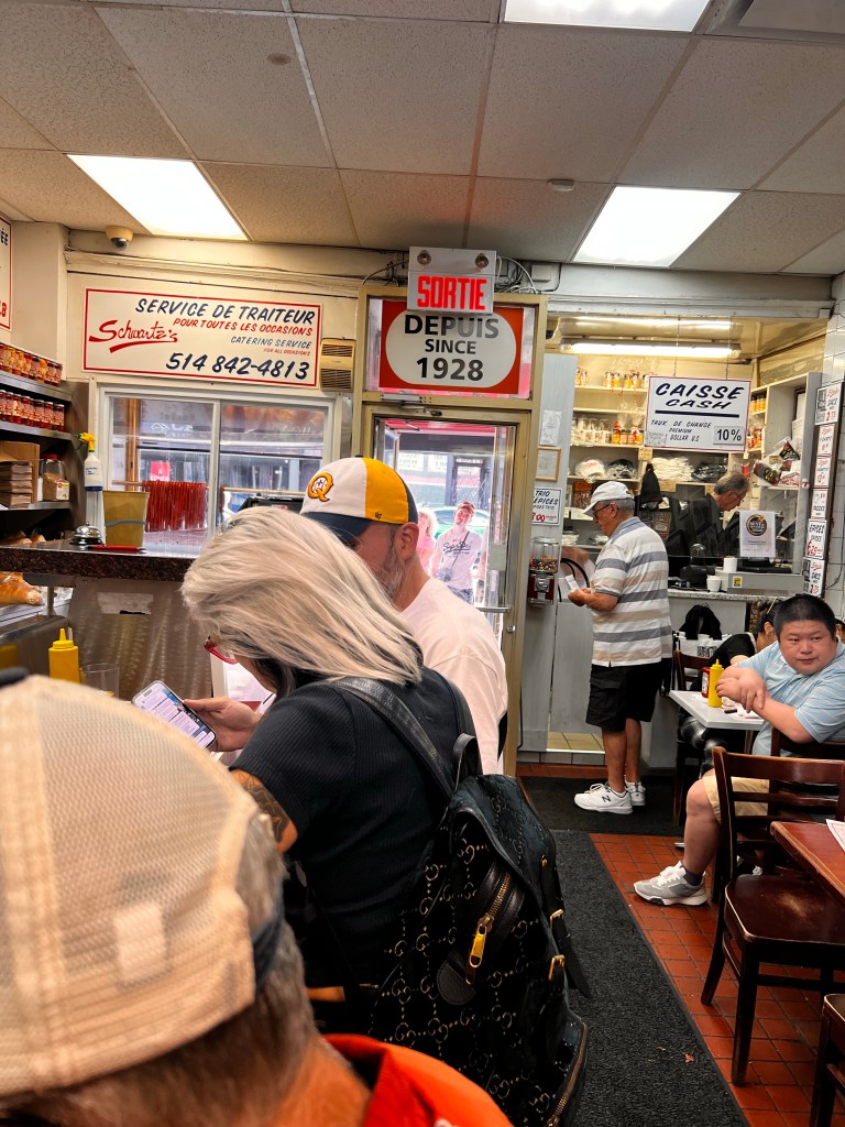 We were told and have read about the Montreal bagel. Unfortunately we did not get to the famous bagel shop. There is also the Hasidic Jewish smoked meats tiny little restaurant called Schwartz’s. My nephew Alex had told me Schwartz’s is a must do. It did not disappoint.! Thanks Alex… the hop on bus guide mentioned it also.