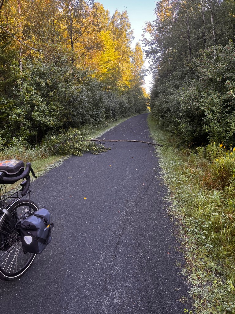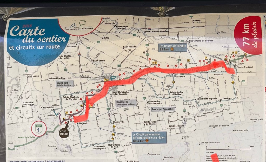 We stopped for lunch in Victoriaville where I sent an email ( Warmshowers method). Leaving Victoriaville turned out to be a mess. We got seriously off route and had to try to find our way back. Too many nice city bike paths to follow and we missed the Route Vert 1 sign. I think we saw the perimeter of the entire 50,000 person town. However, we did spot another good fence. And met a man that really really was determined to get us back on track. We had stopped to check our phone maps when he came outside. Uh oh… our bad French and his very little English. Then he went in the house, we were still trying to figure it out and he comes out with the ripped off cardboard map of the way back to the train route! Ok we’re off to where we started… complete backtrack eventually. But it gets better, he jumps in his car and drives down to the busy street to make sure we’re going the right way. So damn nice… he was a very kind Quebecian.