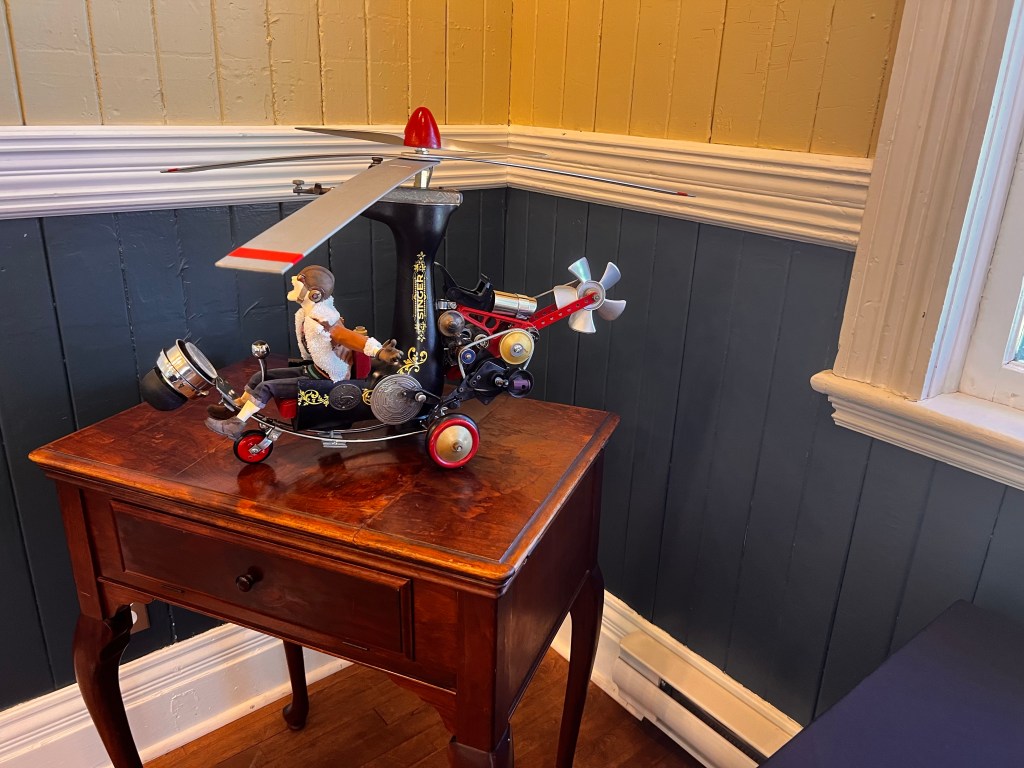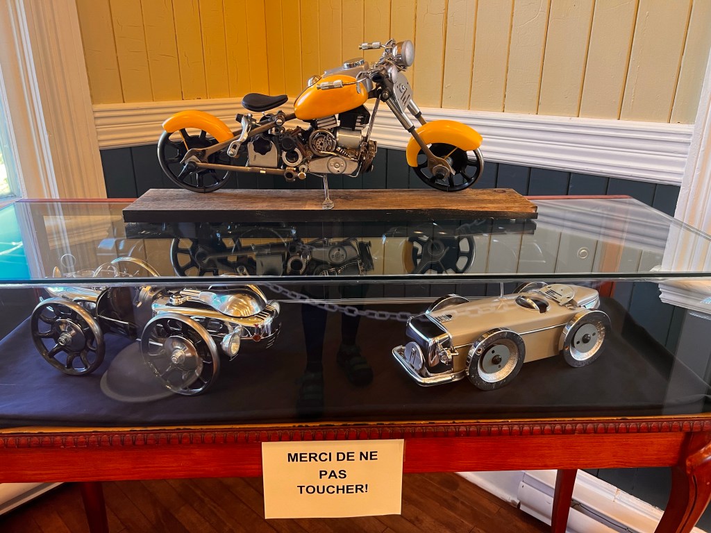 Todays trail was 100% on Route vert 1 and it was another linnear parc (train bed) like P’tit Train du Nord. That means it was flat and easy riding all day. We stopped for a snack break in Warwick. They had a gare museum with antique sewing machines. It had the wildest collection of sewing machine art. Machines made into all kinds of interesting objects. Lots of photos of these. So clever!