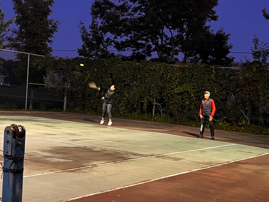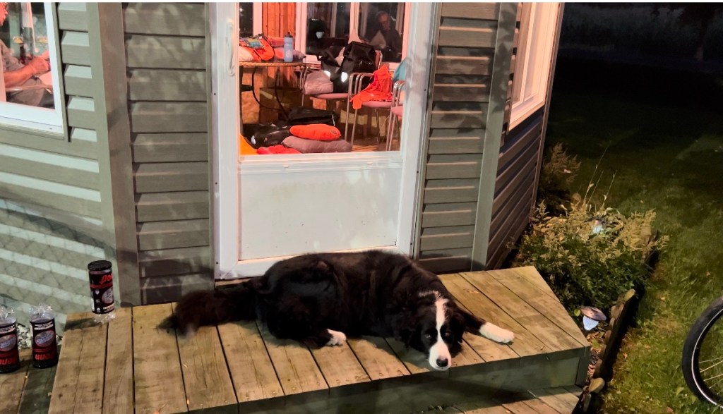 Back on the trail… about 1.5 hr delay…. We decided we were going to eat early dinner in Plessisville then head toward Lyster and find a discreet place to camp along the trail. We’d seen a few rest stops that would work along the way and figured we’d find a decent spot. At dinner we heard from our Warmshowers hosts that we could camp in their yard outside of Lyster. Yeah!! We still had 15 km to go but we set off. Arrived at 7:15pm. Our lights were running out of batteries and daylight was fading. Just in time we arrived. They let us camp in their gazebo next to the tennis court. Perfecto! We settled in while they played tennis with their son and DIL. We will see them early in the morning. Our hosts are Mariette and Irenee. They are tennis players, pickleball players and cyclists.