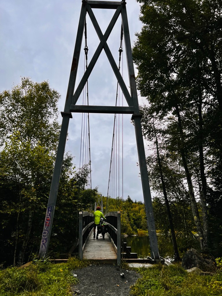 After we left Lisa we came to a cul de sac (dead end) road then a bike trail to a walking swing bridge. It was just a few km.. but a nice departure from the highway.