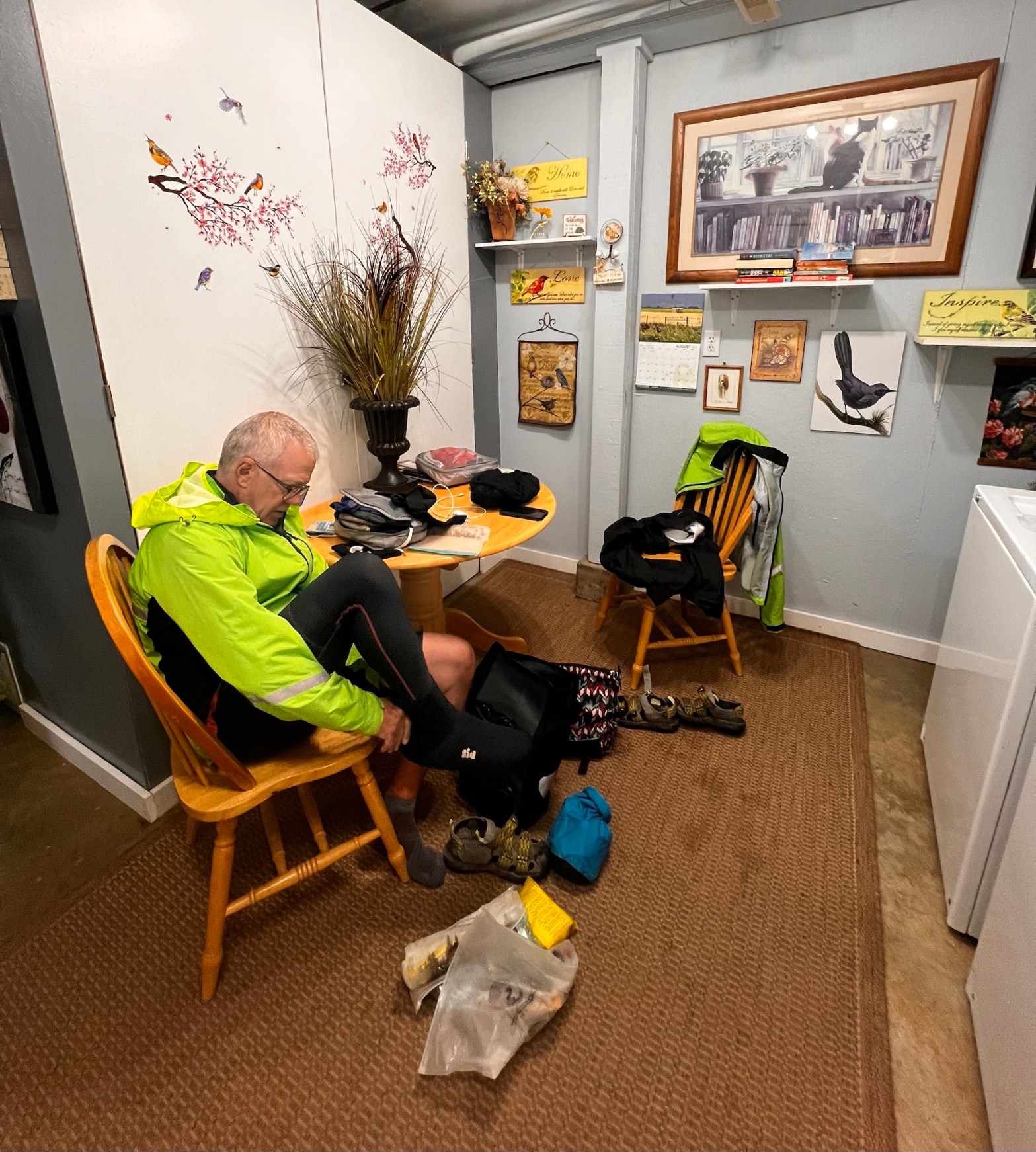 The rain started at 5am. We thought it was suppose to quit by 6am but it got heavier at 6am. So we settled in nice and warm and comfy in our sleeping bags. At 7am there was still no sign of letup… what to do? At about 8am it was letting up for 20 minutes so we started to pack up our panniers. We had just finished this when it started raining hard again. I evacuated to the tent that was still set up and I guess Jim headed up to the bathrooms. After sitting through thunder and lightning for awhile I headed out to find Jim. We took refuge in the laundry room. It was dry, comfortable AND had a table! Yeah! We can have breakfast in the laundry room and wait out the rain. So we went back to our tent area packed up our bicycles and brought them up to the laundry room. We made coffee and banana bread breakfast.