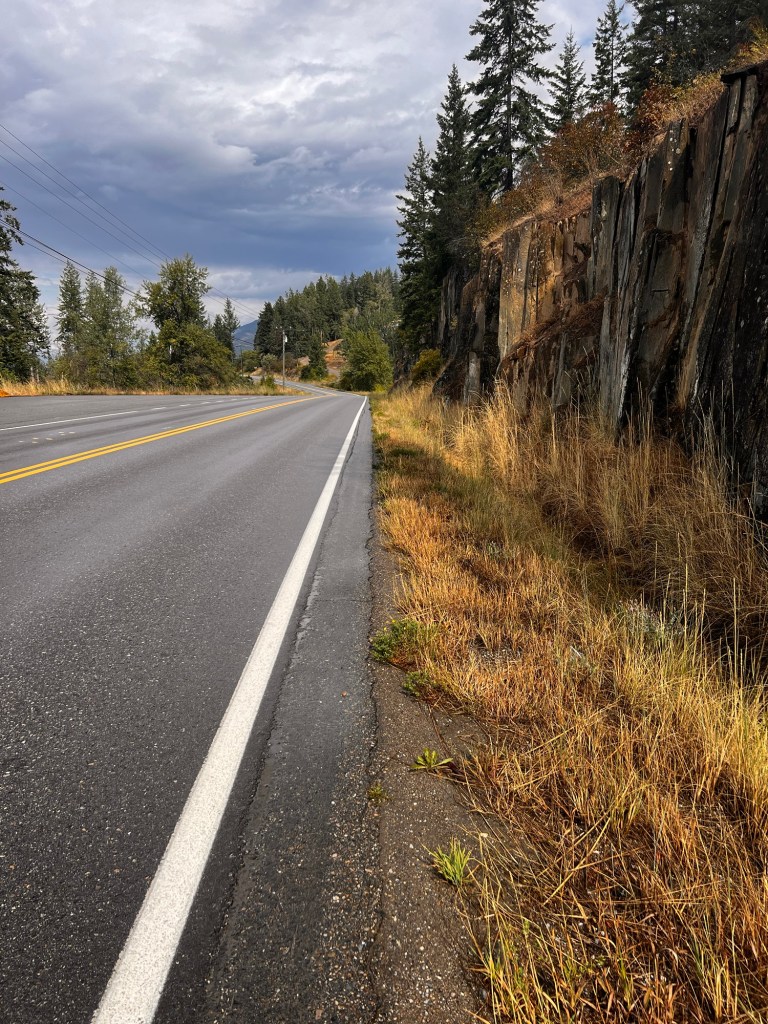 Our highway had a great smooth surface but very small shoulder if any in some places. We were riding high above the Kootenay Lake almost all day. The highway was literally cut into the mountains with big trees and granite walls on our right shoulder. To the left and several hundred feet down was the lake. Google changed from moderate hills after the first 10 miles to “mostly flat”. This is where I questioned the terminology. It was a description in the bicycle mode but I don’t consider it flat when I have to use my granny ring (I have a triple chain ring) to climb almost every hill! The traffic wasn’t terribly busy and every single vehicle that had to pass us gave us plenty of room or slowed down until they could pass. There wasn’t much truck traffic so that helped alot too! We are still amazed at how courteous ALL the drivers were!