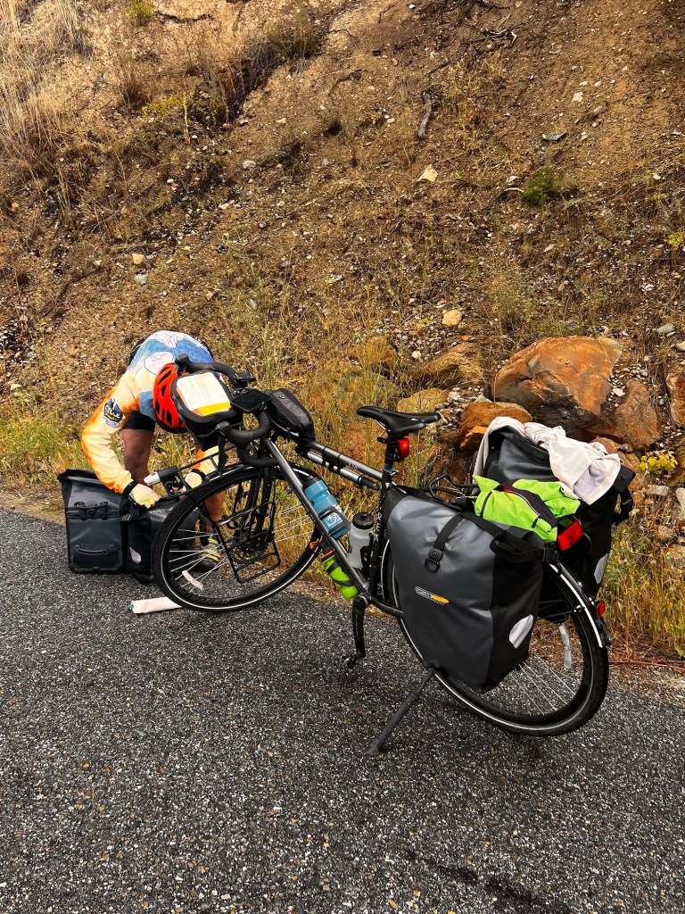 We had moderate hills for several kilometers. One particularly fast descent had Jim’s bike doing the “death wobbles”. He stopped at a safe spot and tried to figure out the issue. His decision was the hasty pannier packing and the right/left weight was lopsided. At first it didn’t solve the issue but after a few more hills he decided it was the wet tent that was top heavy on the rear pannier! After that rearrangement it was smooth sailing!