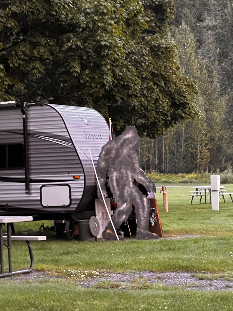 The morning started really nicely. We departed the Bigfoot RV campground about 7:15am. We were on the road before the school buses and the semis. It took almost an hour to get the 9 miles to Ione WA. We decided we’d have breakfast at the little cafe there. It had rained a bit during the night so it was wet at our camp. Packing up and pedaling sounded like a better plan.