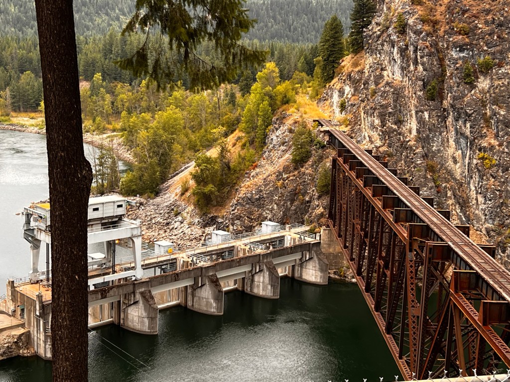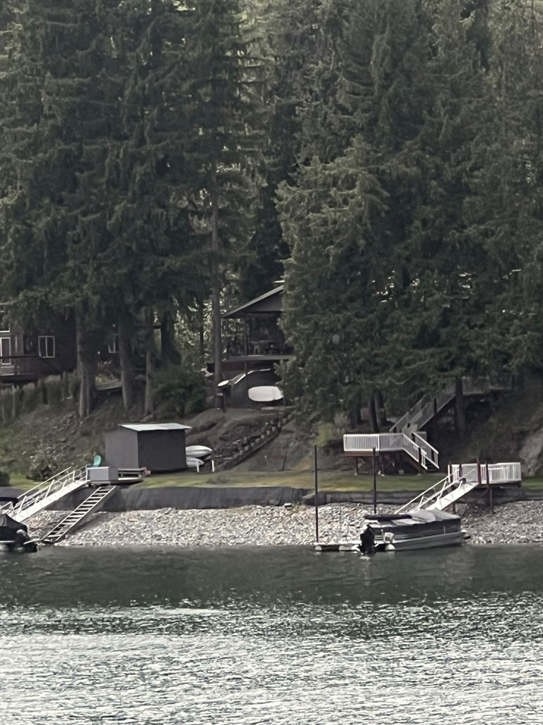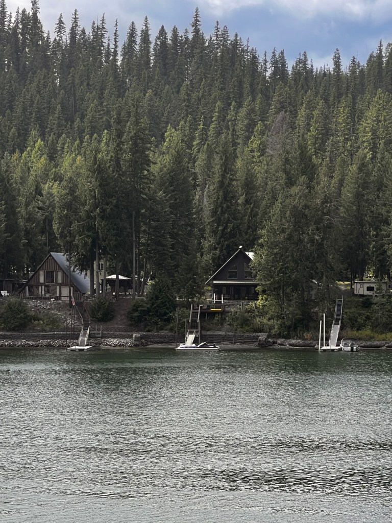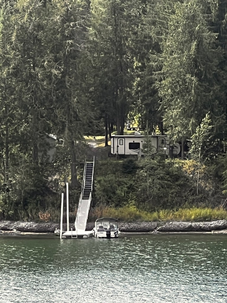 It seems this 50 mile stretch of the Pend Orielle River from Ione to Newport is a continuous vacation home area. Some might be permanent homes but lots of cabins…. lot to lot… various sizes and ages. Sometimes it’s just a parked RV with waterfront. Most of them have stairs and docks for boats. It is a boating river because it is actually continuously dammed for hydroelectric power.