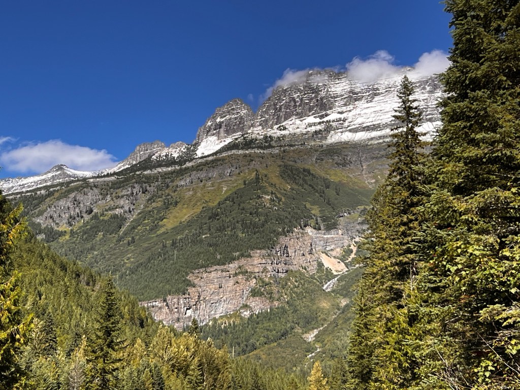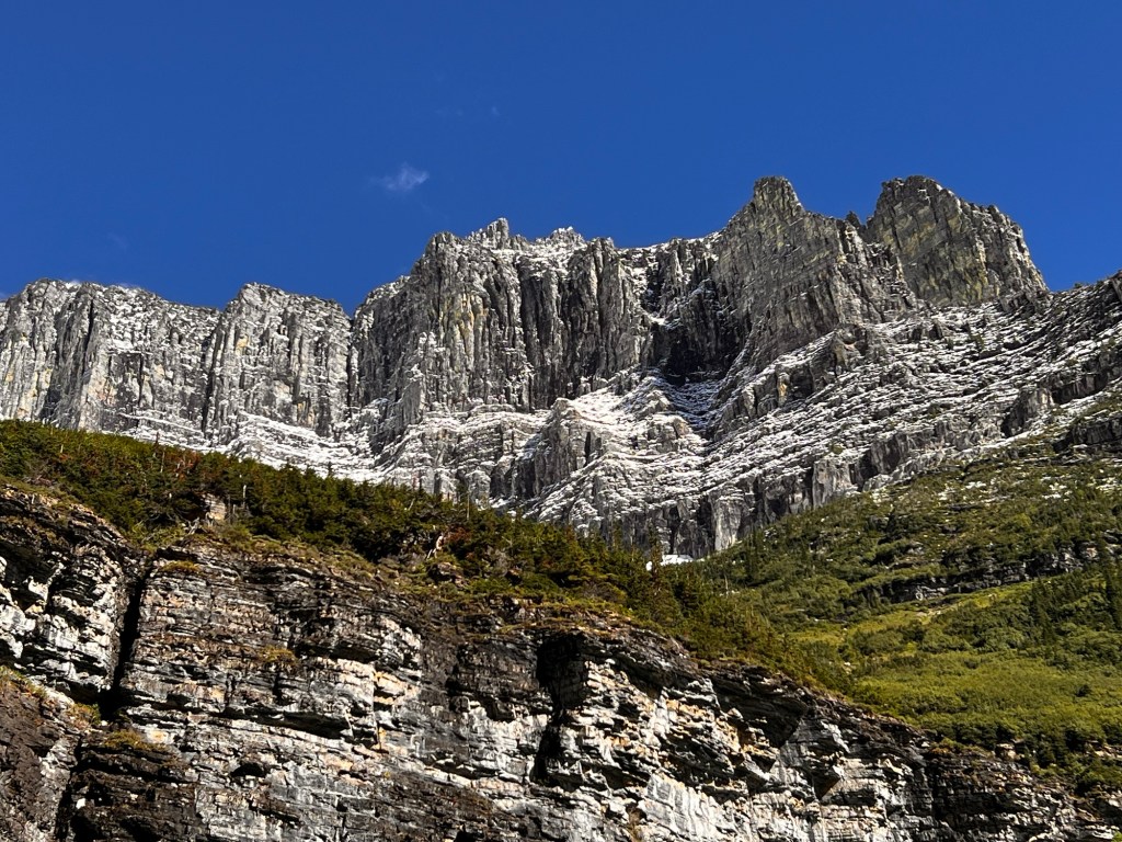 Going to the Sun road is a marvelous piece of engineering up Logan Pass. It is very narrow and climbs up a very steep side of the mountain for 19 miles to the top. You either have a wall on one side or a steep drop off on the other. It is solid trafffic going up at 3 pm and pretty busy for those coming down. There are tons of pullouts with absolutely stunning views of the majestic Rocky Mountains. It turned into a warm comfortable afternoon…even at the top of the pass.