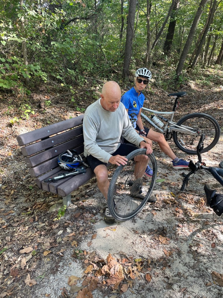About 9 miles into the ride just after the town of Calhoun, Paul got the first flat. Being an experienced cyclist he fixed it pretty fast. Only had to do it once!