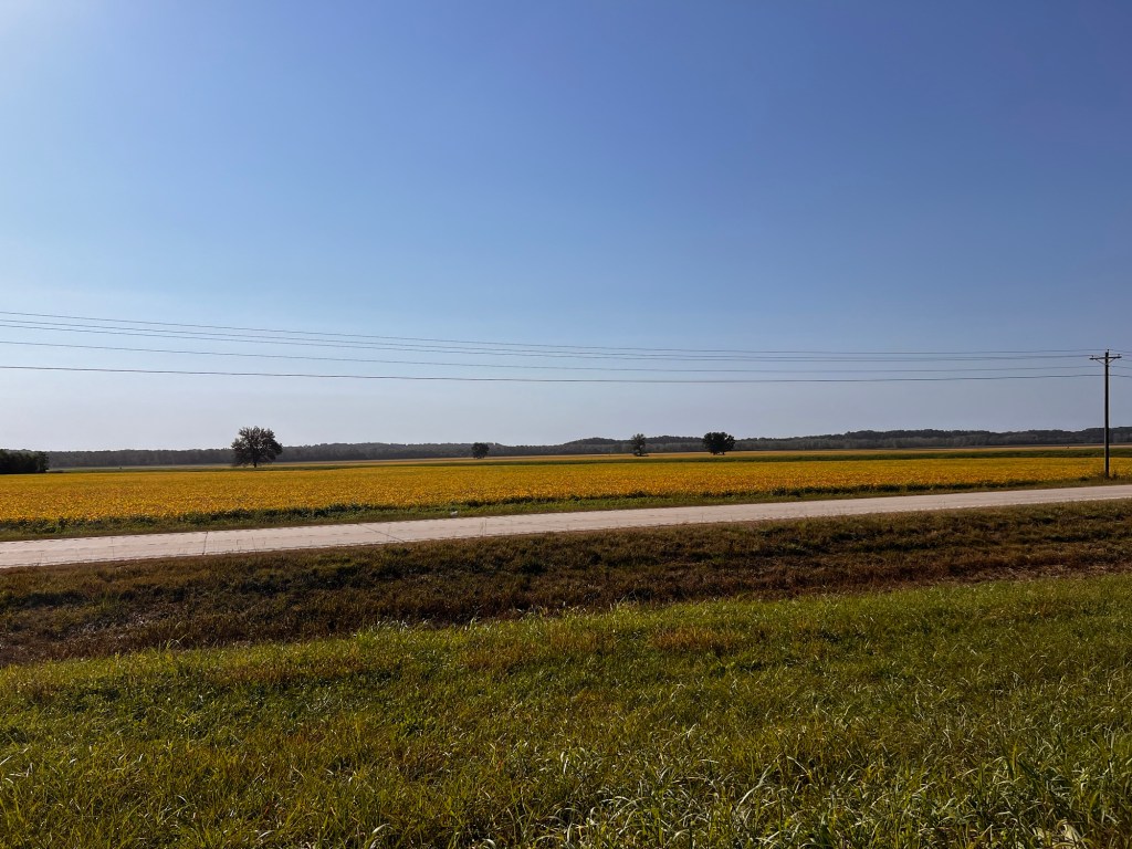 The last 15 miles ran along the bluffs for about 5 miles then opened into the farm fields for the final 10. It was warm but not as hot as yesterday and we had a slight tailwind so it was comfortable riding.