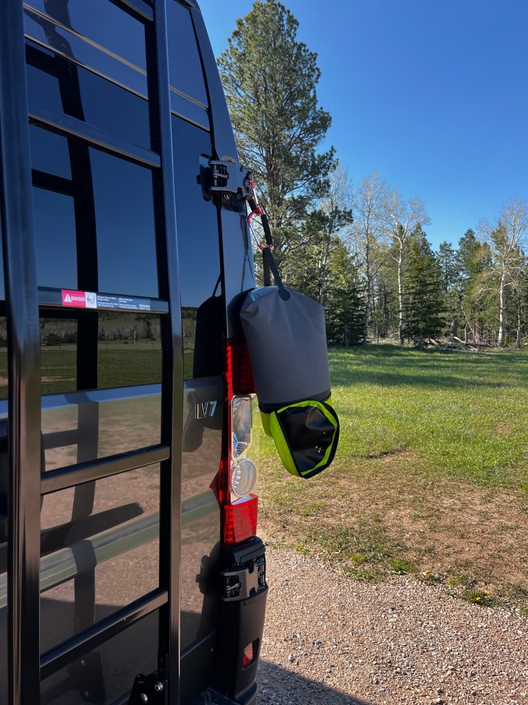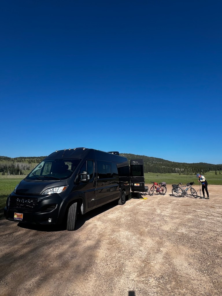 We made the 3 hour climb back to our van. At the trailhead we decided to shower with our camp shower. It’s not part of our van. We left the water bag out in the sun while we rode. We struggled to use our “camp shower” that we’ve had for years. We haven’t actually used it in several years and it wasn’t cooperating well at all. Needless to say it was a dribble shower. Failure I’d say. We will try again tomorrow after our ride.