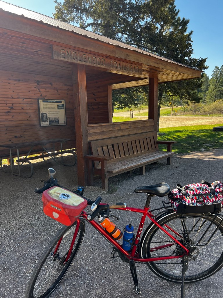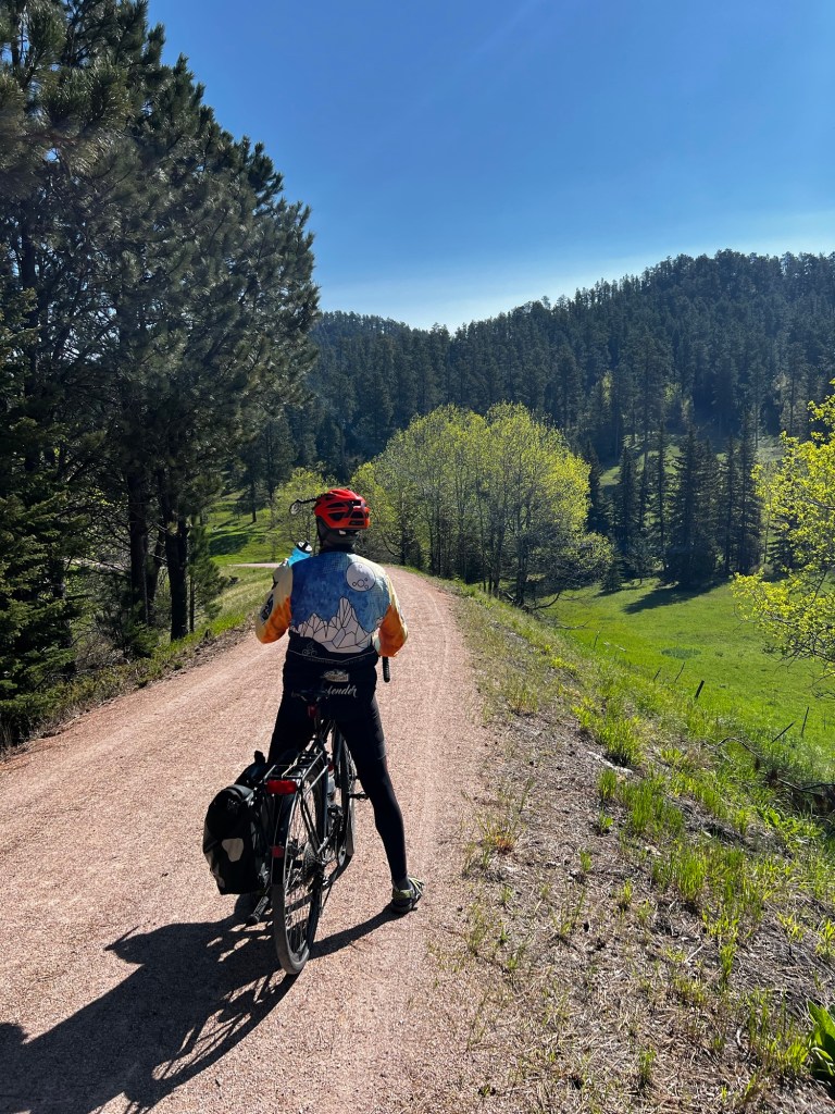 Rode slight uphill grade for about 1.5 miles. Then we began a really nice descent for 14.5 miles to Deadwood. Jim said we were going 18mph at times without pedaling. We were traveling through pine trees, aspens, open meadows but mostly forested the entire way. Most of the railroad bed grade is 4% or less. There was a short section where the bed had been flooded out and we were rerouted. That section had some steeper climbs but they were short walks for us.
