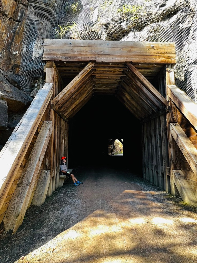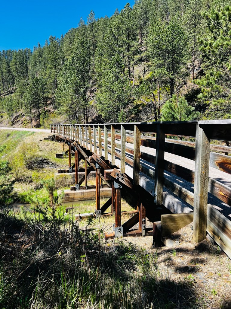 This section of trail had 2 short tunnels and several tall trestles. The entire way we had a creek very near the trail to enjoy. We had some pine forest but mostly beautiful grass valleys with pine hill tops. Such beautiful country. It’s a treat to ride and the trail condition was as good as yesterday!