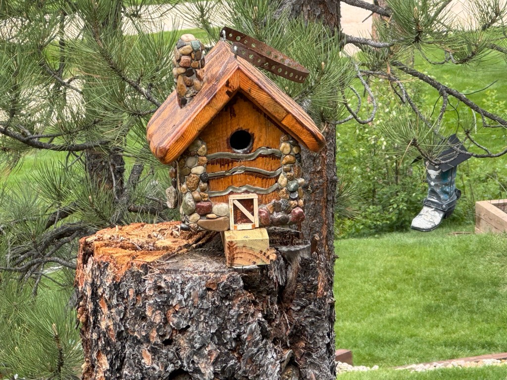Close up of the cute birdhouse and then to the right… surprise!… boot birdhouse