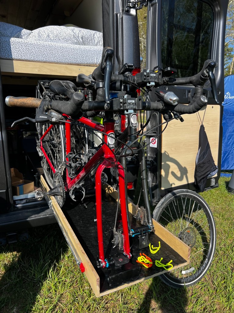 Two bikes… one tray. We actually have a better arrangement now. The outside wheel fits between the bikes