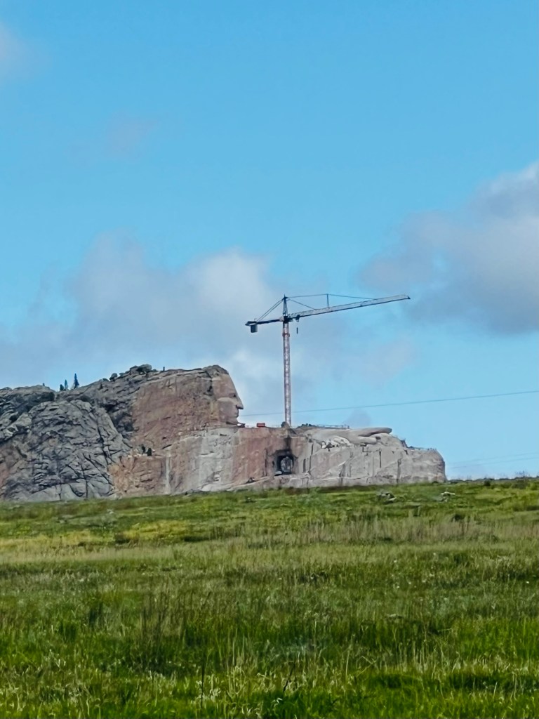 At the highest point was the turnoff to the Crazy Horse Memorial. We did not take the time to visit but got a pretty good description of the project from the volunteer at the Custer City Visitor Center. It is under construction ALL from donated money. They are not using any public funds for this gargantuan scupture. The size of it when it’s done could fit the Mt Rushmore faces in the hole under his arm!