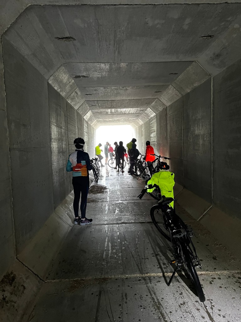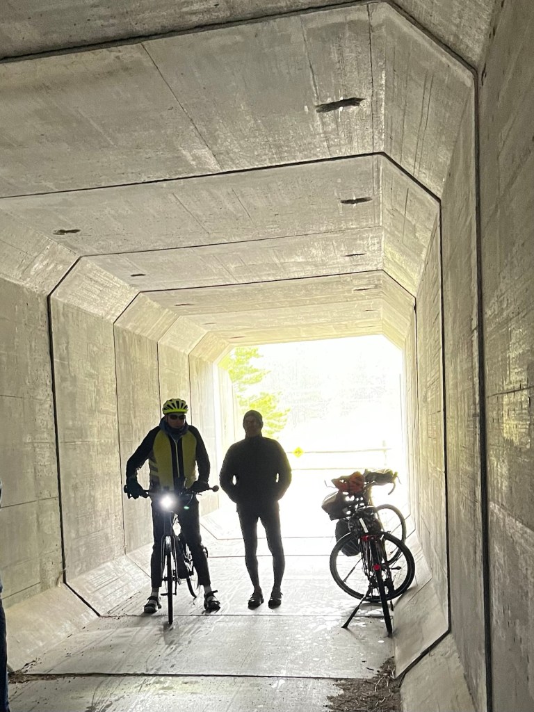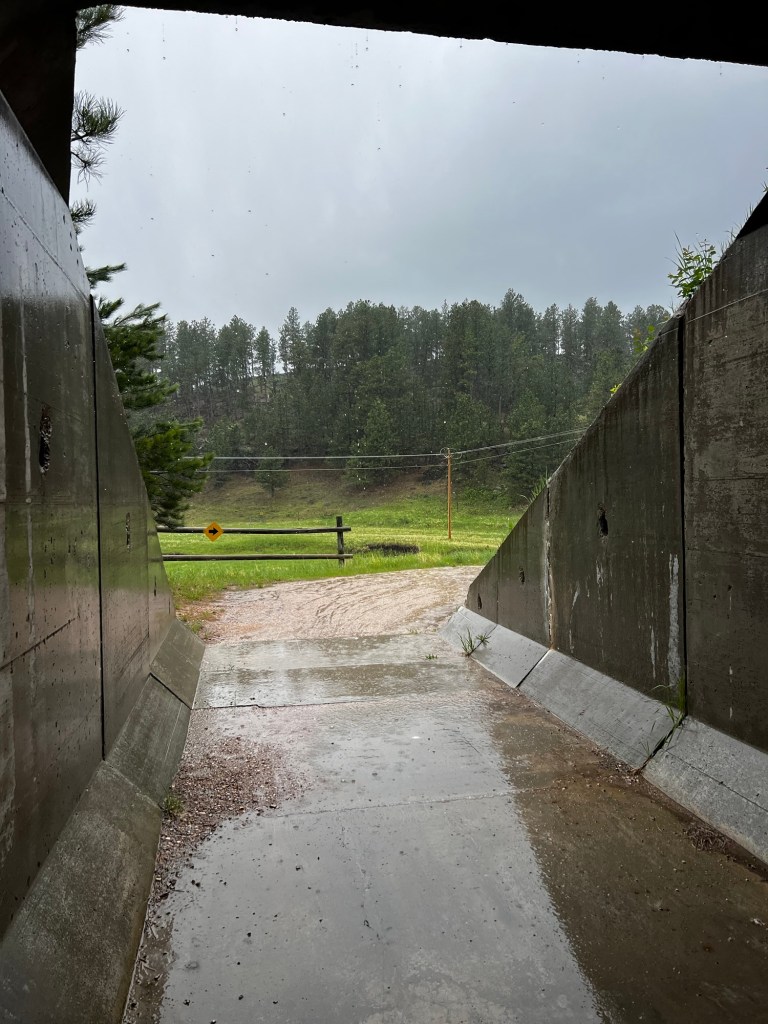 The rain hit fast and hard. We were going about 23 mph without pedaling at times. Remember the tunnel under the road I mentioned? As soon as we got there we stopped. It was a fairly long concrete shelter from the weather. Good pit stop for about 15 minutes! During our wait it began to rain even harder with a little sleet. The tunnel began to fill up with cyclists!! Party in the tunnel… ha ha ha. After waiting for it to ease off a bit we were pedaling hard for the last 4-5 miles to Hill City and our dry, warm van! It hadn’t even rained in Hill City. Our last mile was dry. No complaints about that. I was wet and cold (my legs and feet). Took awhile to warm up after changing into dry, warm clothes.