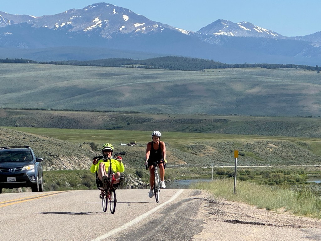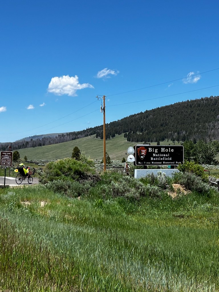 The morning winds were very, very light, barely noticeable. Everyone was in high spirits. The e- bikes were quickly out of sight and everyone riding at their own comfortable pace with short stops along the way. Quick pit stop in Wisdom at 25 miles then off to the BigHole Battlefield 10 miles further south and the uphill climb toward the continental divide. Lunch was at the battlefield parking lot.