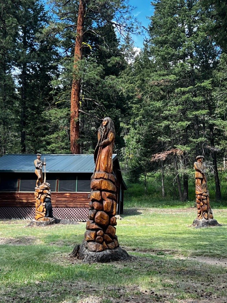 Lost Trail Hot Springs Campground is a quirky, funny little place. It’s 6 miles down from the summit in a deep ravine filled with giant ponderosa pine trees. Big disappointment was the fact that the hot springs pool was not opened for the season yet. Tomorrow! They were just filling it when we arrived. Besides the campground, there are a bunch of little cabins, the owners place and what used to be a pizza restaurant and bar. That hasn’t been open for several years now to my knowledge. As you enter the pool area you are bombarded with rules signs. So many signs it’s hard to decide which ones to read. The less is more principle could be applied here. The owners are a strange bunch, grandma, son etc. Today the owner was gone and left a full time tenant in charge of our cabins and camping. I did not meet him myself but was told he was very odd. He had lots of holes in his clothes and had a pistol lying on the countertop! Needless to say that no one bitched about the closed pool… good choice to let some issues be left silent!