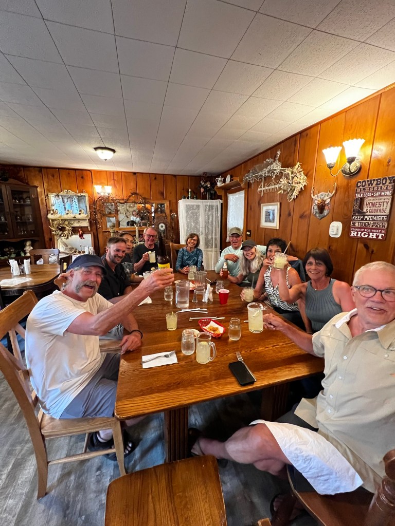 Dinner tonight was a drive over the border into Idaho to Gibbonsville maybe 20 miles south. The Chief Joseph Pass on the Idaho side is much longer than the Montana side. Several big impressive switchbacks for about 12 miles down into a deep river valley of the Northfork of the Salmon River. (Side note: famous for whitewater rafting). We eat at the cutest little Mexican restaurant called the Broken Arrow. It’s owned by a family with several generations of the family working there. Besides the very good Mexican food they have several flavors of homemade pies! It’s a real gem of a place. We randomly found it when our ride took us to the Lost Trail side for a couple of years. It’s now part of the tour to have dinner at Broken Arrow.