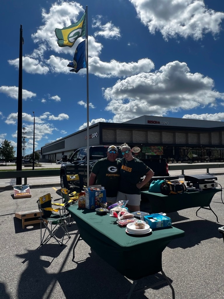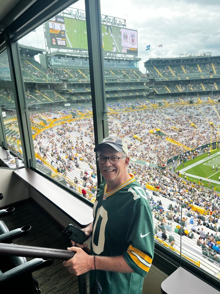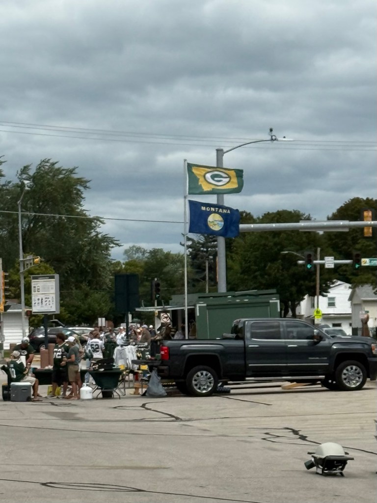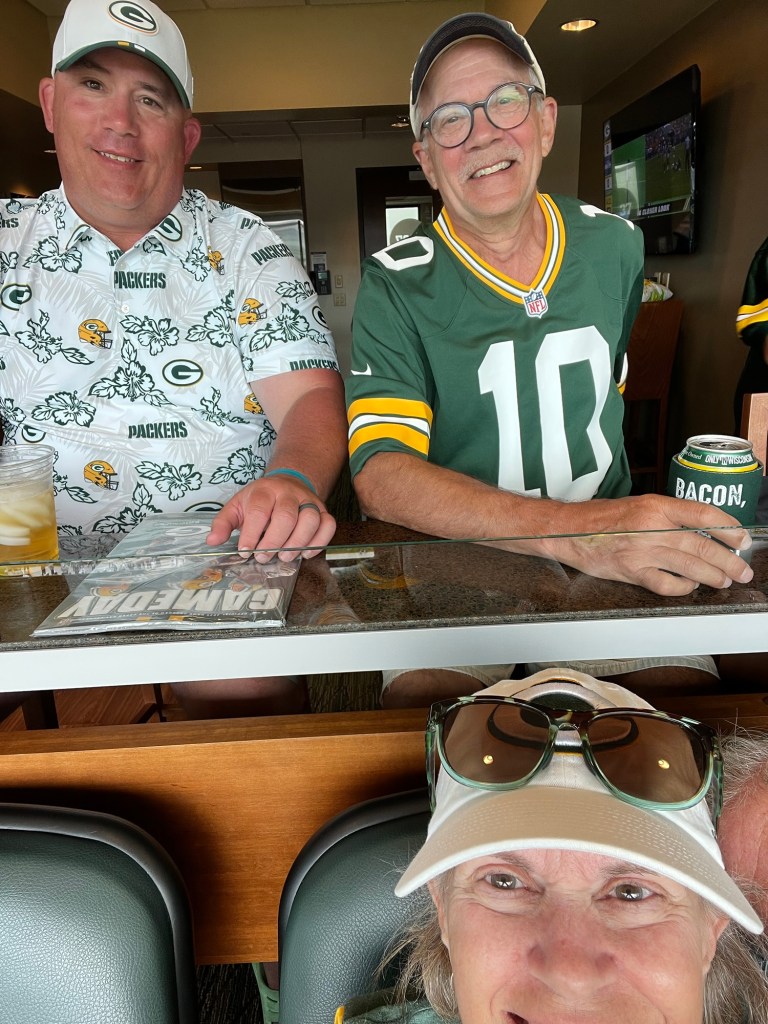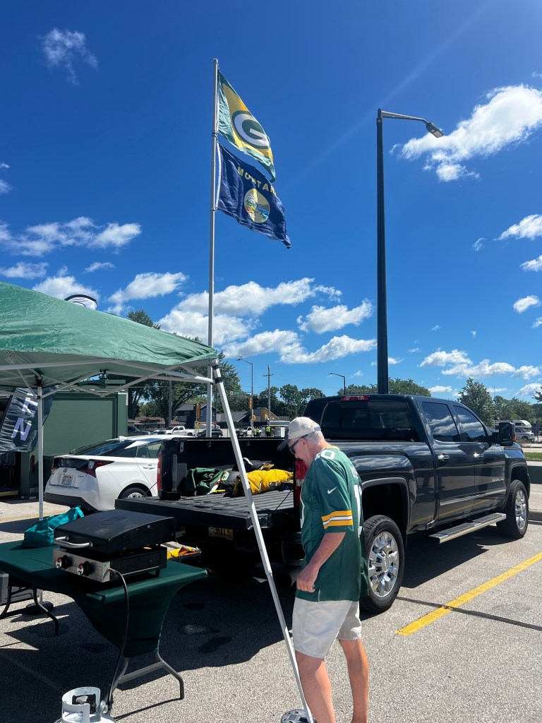 Green Bay Packers Football Game Today was a big day… my first NFL game and visit to Lambeau Field! Erin and Ryan are BIG Packer fans (understatement) with lots of local connections. They are part owners of a skybox so we were really introduced to top tier Packer experience. We started with their tailgate party. Arrived 3 hours before game time. They have their tailgate routine down pat. Bacon, brats and beer…and a shot ski tradition. They fly a Packer flag and a Montana flag… symbolizing Ryan’s Montana roots and Erin’s several years living in Montana.