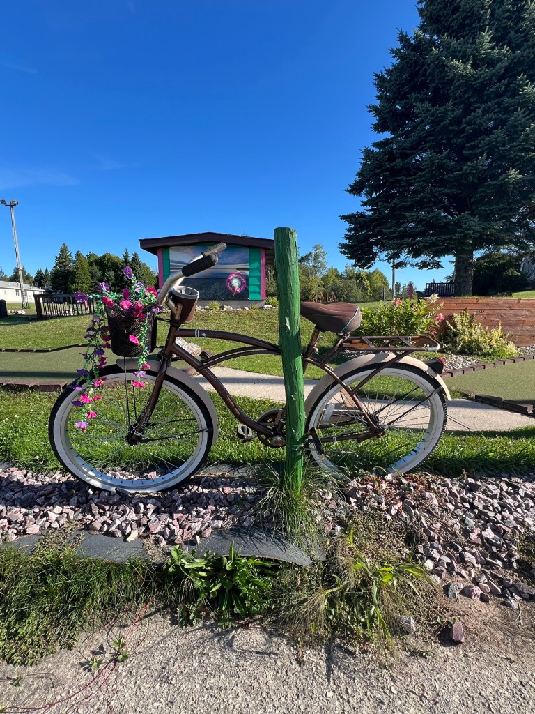 The usual 9:15 departure with a quick stop at a grocery store for apples and bananas. We weren’t riding long when I spotted this amusement putt putt golf course, kids playground and ice cream joint. It was the bicycles along the perimeter that caught my eye.