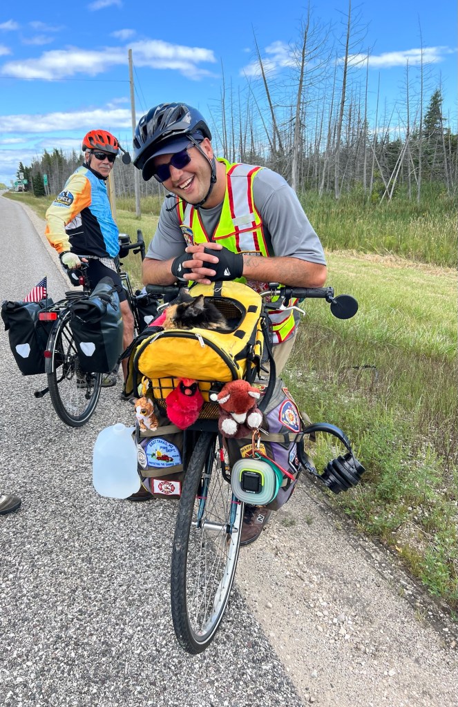 Until we met a young man named Caden traveling on the shoulder we had seen only one other cycle tourer just out of Saumico WI. Caden was a really nice young man (guessing late 20-early 30) who has been traveling by bicycle for months (years?). He’s a videographer… no hint how he pays for his travel. He travels very lightly with his cat Marilyn and has absolutely nothing new or fancy on his old bicycle so he’s not sponsored by cycling products. I’m guessing his camera equipment is good! Anyway he has ridden across the US 7 times! He often camps at Fire Stations. He’s visited like 500 fire stations or police stations while bicycling. He’s got the patches on his vest and panniers to prove it. He started in New Hampshire and was turning south along the Lake Michigan shoreline and headed south. You can check him out on Facebook or Instagram @CalebplusMarilyn.