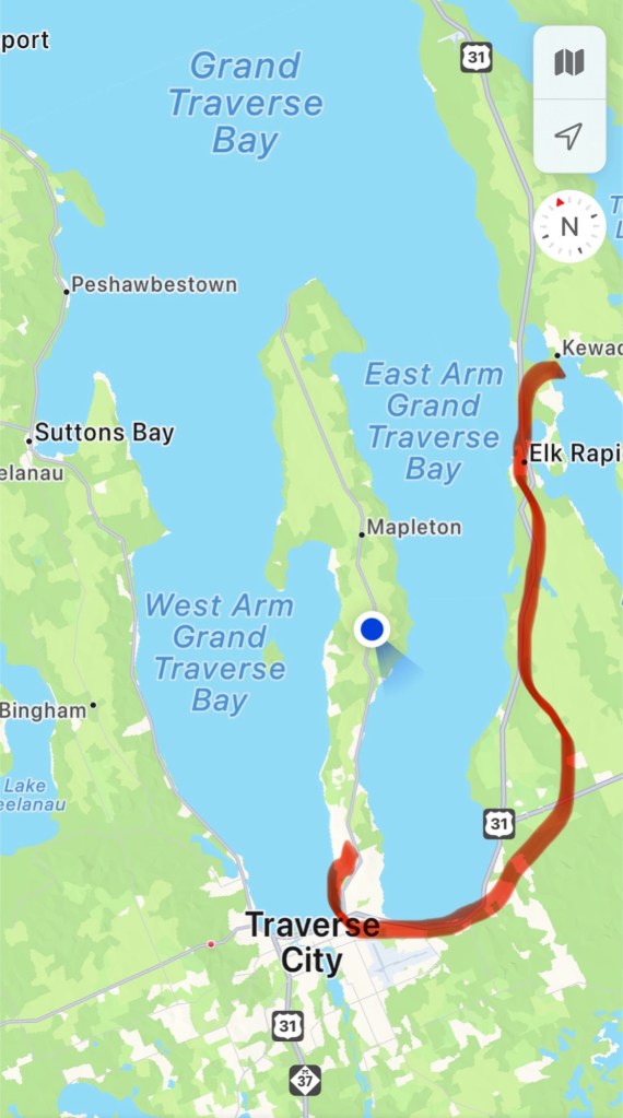 Tomorrow we head up north on the West Arm of Traverse Bay then west over to Lake Michigan heading south again along the shoreline to Glen Arbor. I believe we will be back on the TART Trail to the Leelanau Trail. We hope to have a favorable tailwind and no rain.